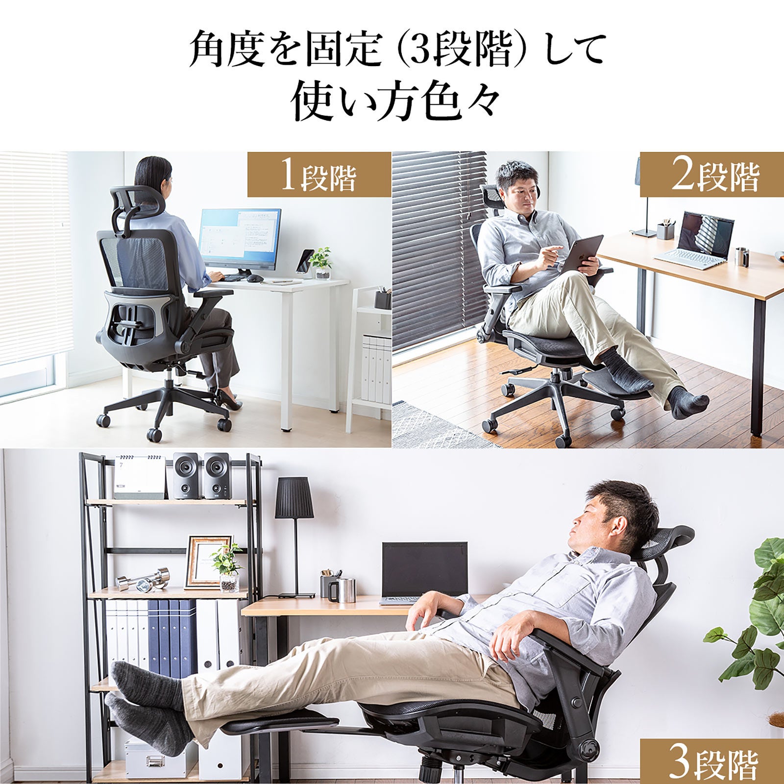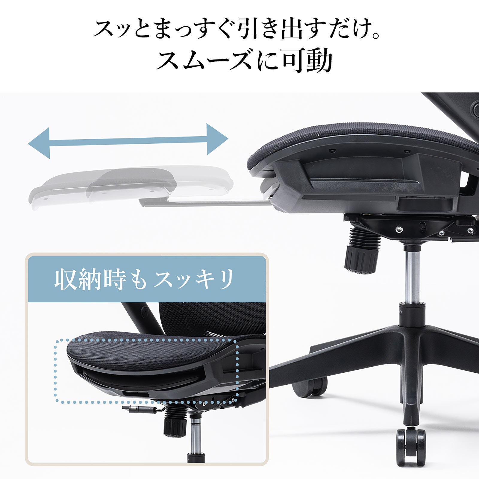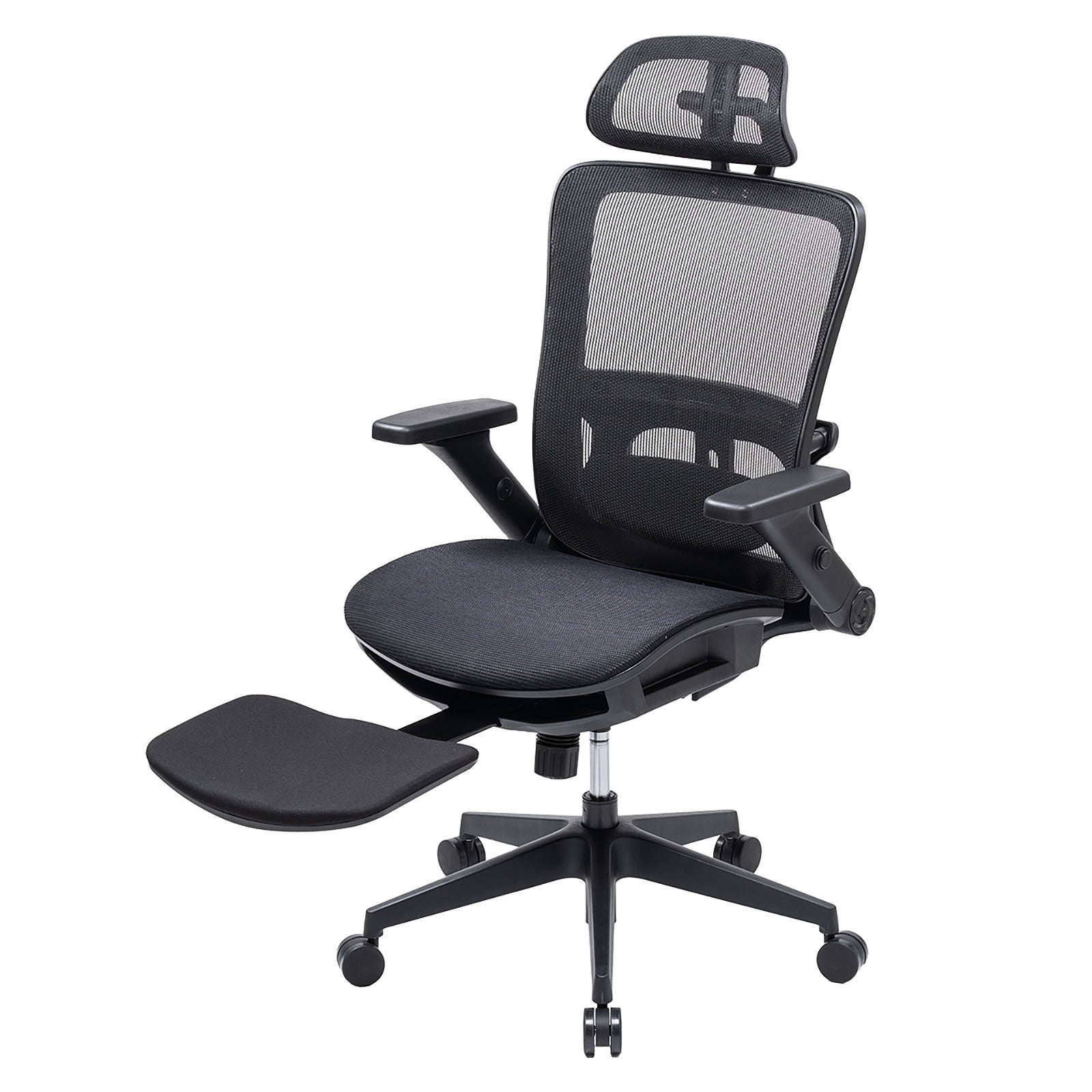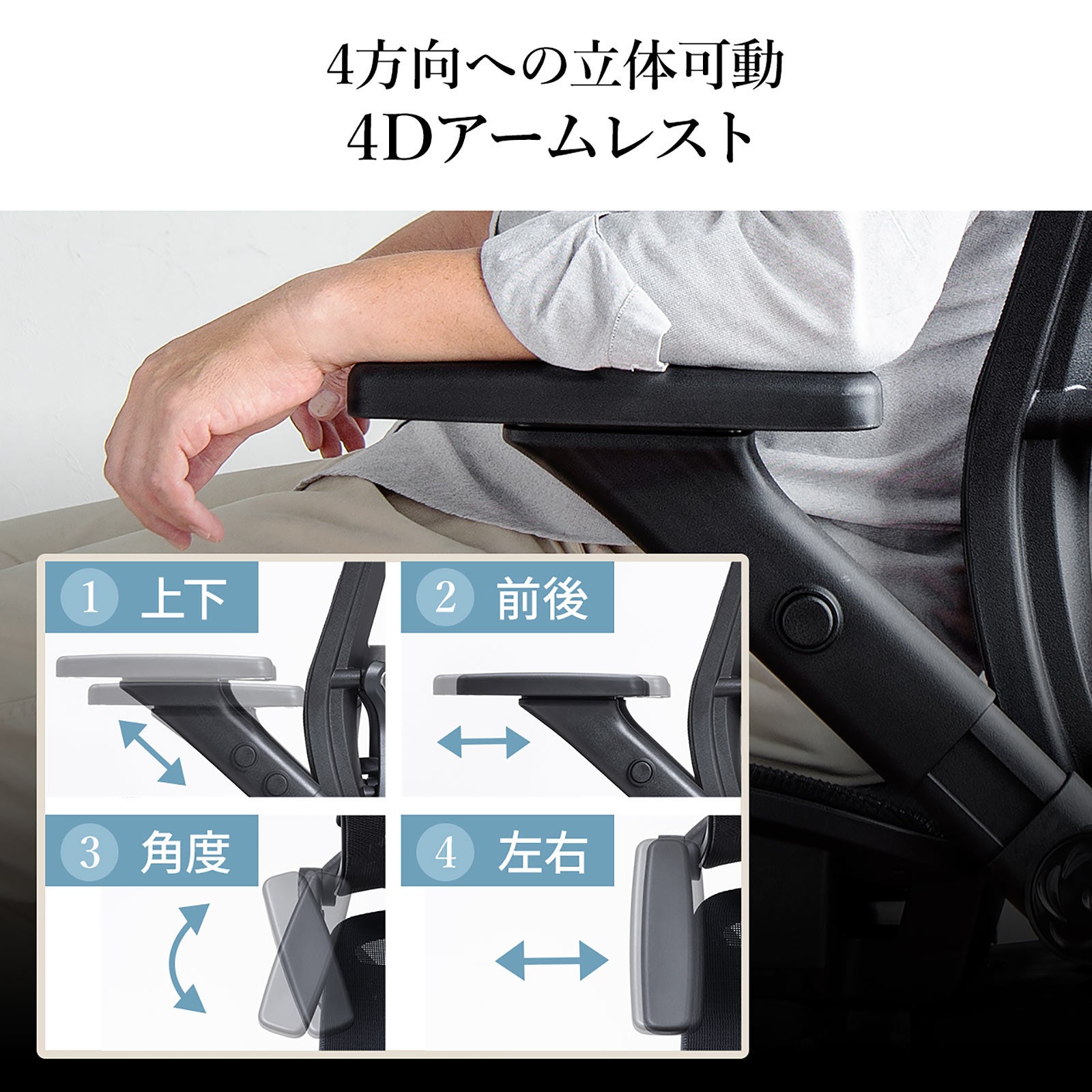 メッシュチェア シンクロロッキング ロッキング固定 跳ね上げアームレスト 薄型オットマン付き 4D ランバーサポート