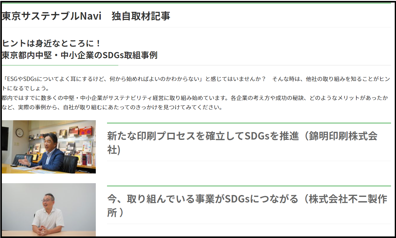 | ①企業のSDGs取組事例 | 自社の取組を検討する際に参考となる、先進的な取組事例を拡充し、 サステナビリティ経営に取り組んだ企業を独自取材 |
