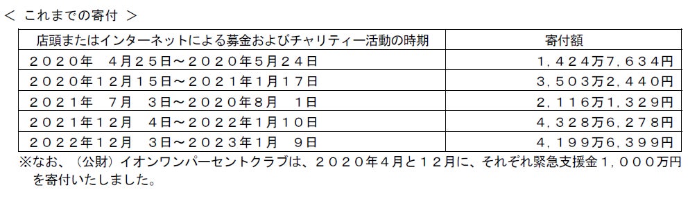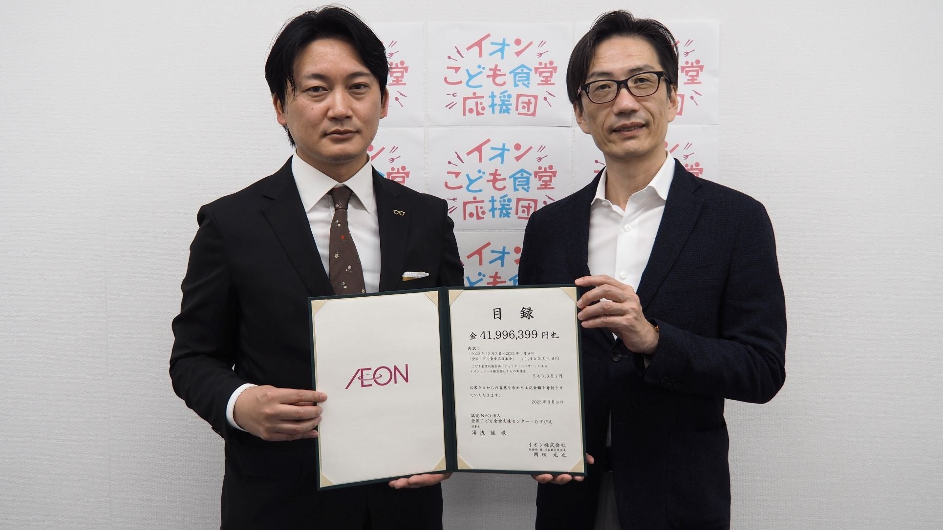この活動の一環として、2022年12月3日から2023年1月9日まで全国のイオングループの店舗 約8,000カ所などで、通算5回目となる募金活動を実施しました。皆さまからお寄せいただいた募金4,145万3,048円に、イオンリテール(株)で実施したチャリティーバザーの売上金54万3,351円を加えた4,199万6,399円を、3月9日(金)にむすびえに贈呈いたしました。2020年春からの累計募金額は、1億7,129万1,191円となり、こども食堂の運営に必要な資金や家庭に食品を届ける活動などにお役立ていただいています。