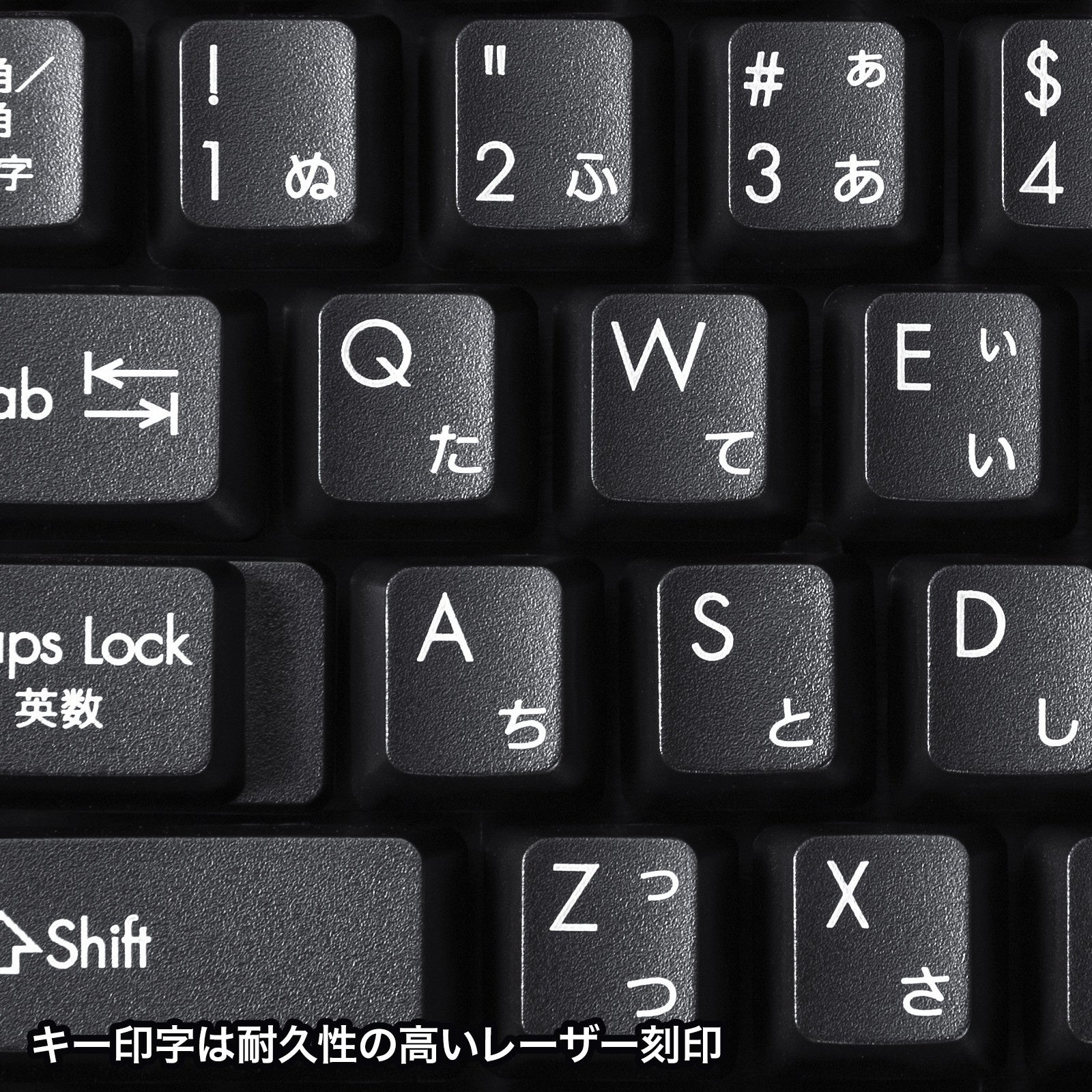 キーピッチはスタンダードキーボードと同じ19mmキーピッチで、キートップは標準的な深い押し心地のメンブレンタイプです。また、文字の耐久性に優れたレーザー印刷を採用しています。