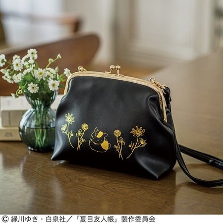きめ細かなツヤ感のある合皮とゴールドプリントが上品な、ニャンコ先生と野花がモチーフのがま口バッグです。