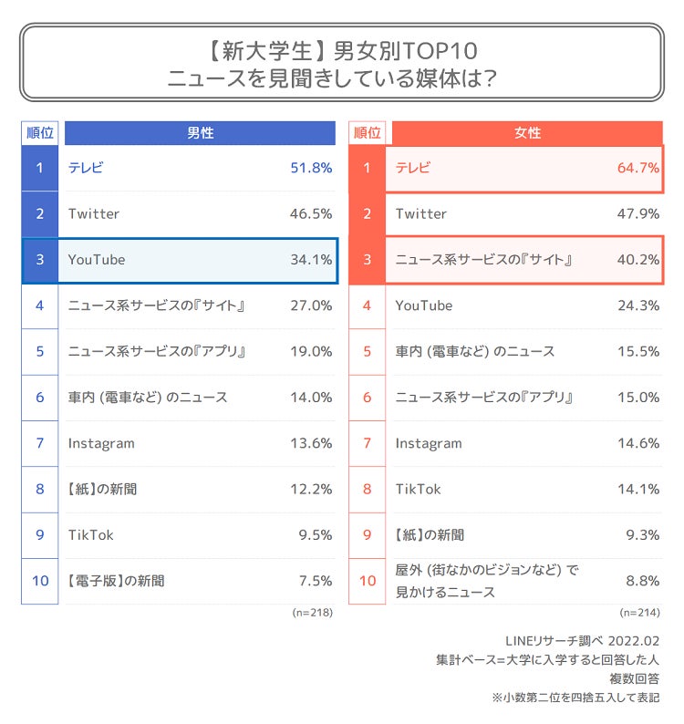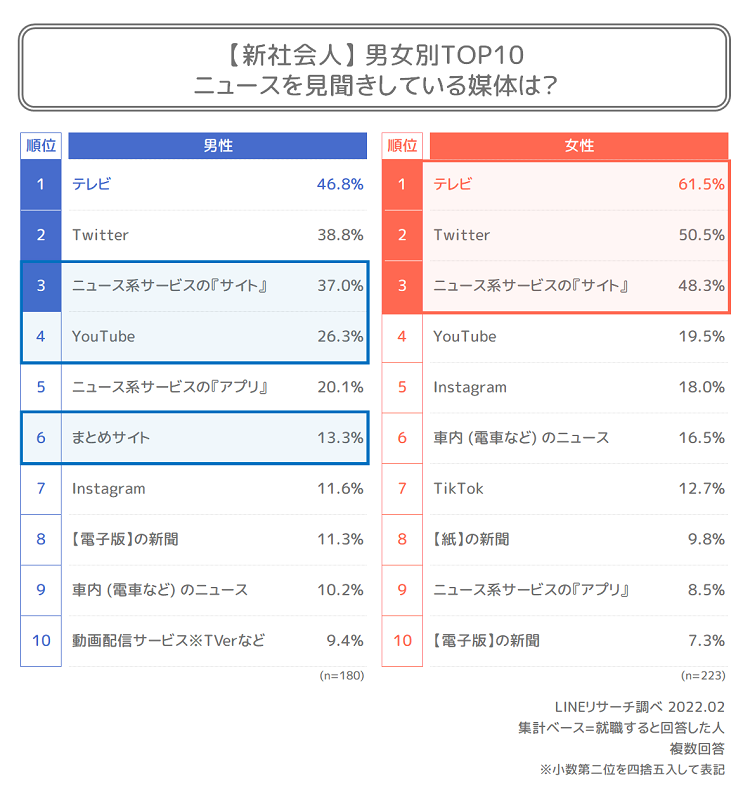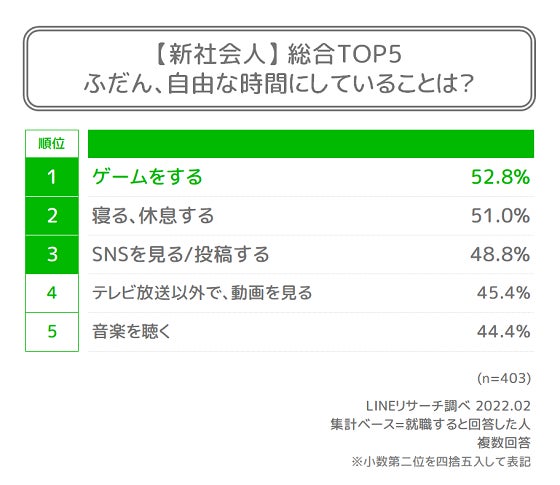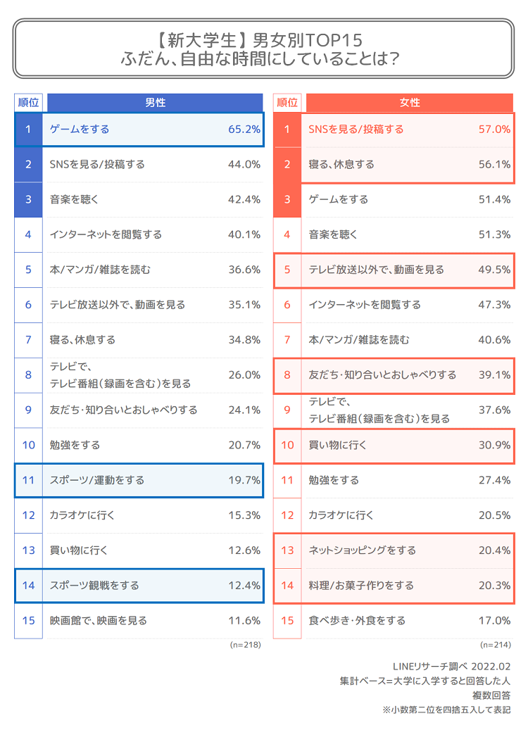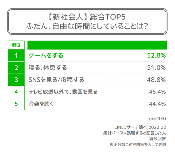 【LINEリサーチ】新大学生・新社会人ともに自由時間の過ごし方は、男性は「ゲーム」、女性は「SNSを見る/投稿する」が1位 ニュースを見聞きしている媒体は男女ともに「テレビ」「Twitter」が上位