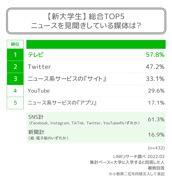 「新大学生」の結果をみてみると、全体では「テレビ」「Twitter」「ニュース系サービスの『サイト』」が上位となっています。「テレビ」がもっとも高く、約58%でした。また、SNSいずれかのサービスを合わせた「SNS計※」では、「テレビ」を上回る結果となり約61%でしたが、その中でも「Twitter」が圧倒的に高い割合となりました。