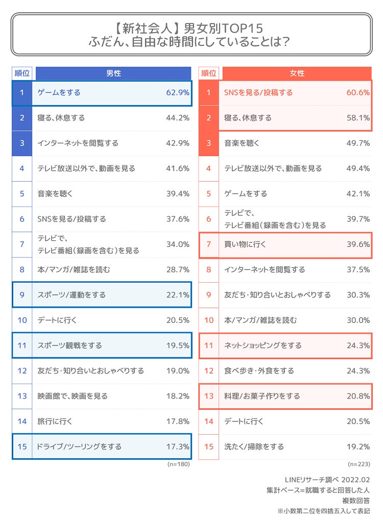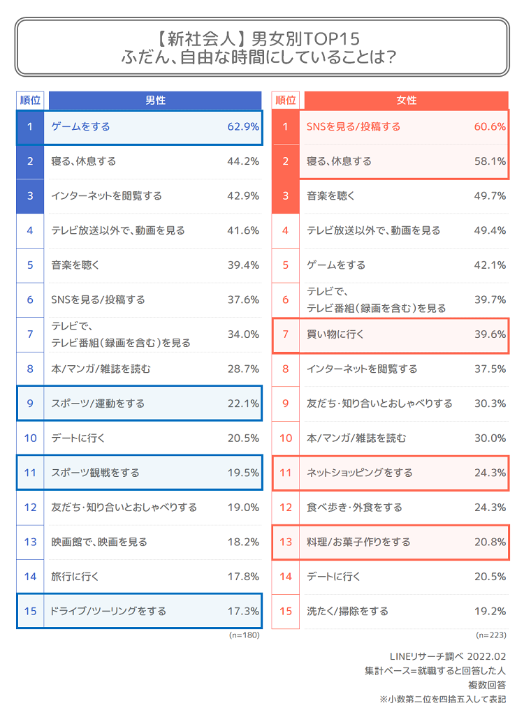 また、新社会人になると「デートに行く」「ドライブ/ツーリングをする」なども2割前後と15位以内に入ってきます。加えて「スポーツ/運動をする」「スポーツ観戦をする」は女性に比べて割合が高い傾向にありました。