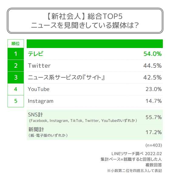 続いて、「新社会人」の結果をみていきます。全体では「テレビ」「Twitter」「ニュース系サービスの『サイト』」が上位となっています。「テレビ」がもっとも高く、54%でした。一方で、SNSいずれかのサービスを合わせた「SNS計※」は約56%となり、僅差ではありますが「テレビ」を上回っています。また、「新聞計(紙、電子版のいずれか)」は約17%でした。