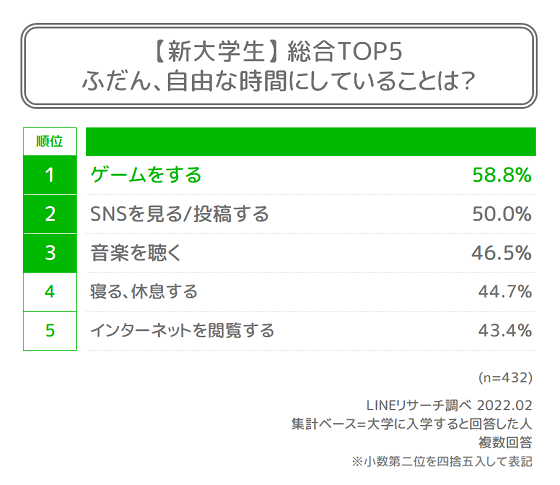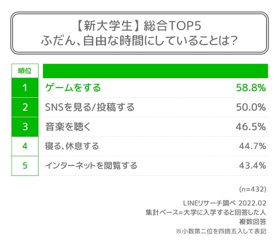 このたびLINEリサーチでは、全国18歳から24歳までの男女を対象に、4月から大学に進学をする予定がある新大学生、就職する予定がある新社会人を中心に、自由時間の過ごし方やニュースを見聞きしている媒体について調査しましたので、その結果をお知らせいたします。