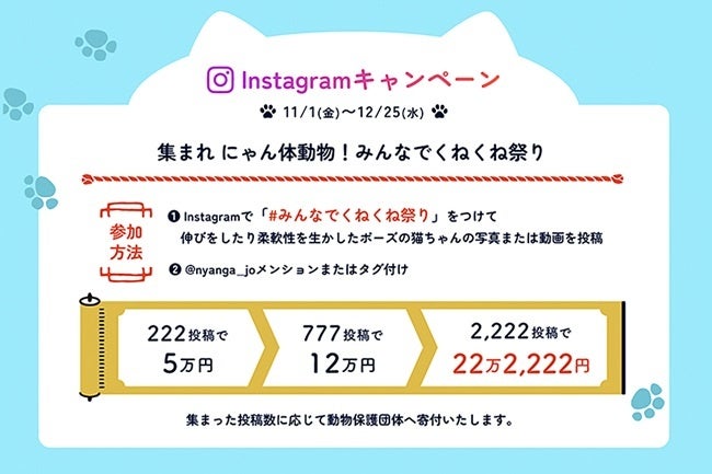 ハッシュタグ「#みんなでくねくね祭り」がついた写真または動画の総投稿数に応じた金額が、動物保護団体・日本アニマルトラストへ寄付されます。
