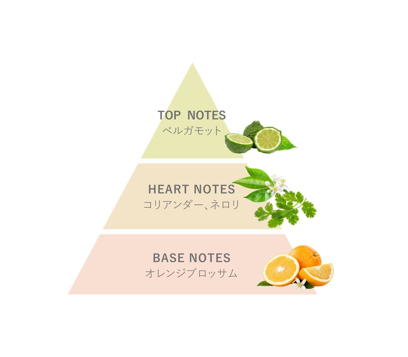 透明感あふれるベルガモットから始まり、ネロリやコリアンダーが清らかさを醸し出し、さらにオレンジブロッサムが柔らかさと輝きを注ぎ込む。呼吸を深める深遠さがありながらも軽やかに広がり、感性を澄み渡らせるようなフルーティフローラル。