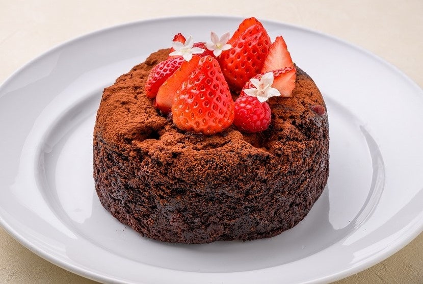 当ホテルでは、2023年9月より菜食主義の方や健康へのこだわり、信仰上の理由などによる食の多様性への取り組みとして2023年より、レストランでヴィーガンメニューの提供を行っています。このたび、多様化するライフスタイルやヘルシー志向の高まりを受け、どなたにも美味しく、そして安心して召し上がっていただけるヴィーガンスイーツ「島豆腐ガトーショコラ」をホールケーキでご用意いたしました。ガトーショコラの生地には小麦粉やココナツミルクのほか、沖縄の食材・島豆腐が練り込まれており、しっとりした食感をお楽しみいただけます。ほかにも、てんさい糖とフランボワーズを煮詰めて作ったヴィーガン用ジャムやメープルシロップも生地に入っており、ベリーの甘酸っぱさに加えて濃厚な甘さをお楽しみいただけます。いちごやフランボワーズのトッピングが可愛らしい、お祝いやパーティーにおすすめなケーキです。