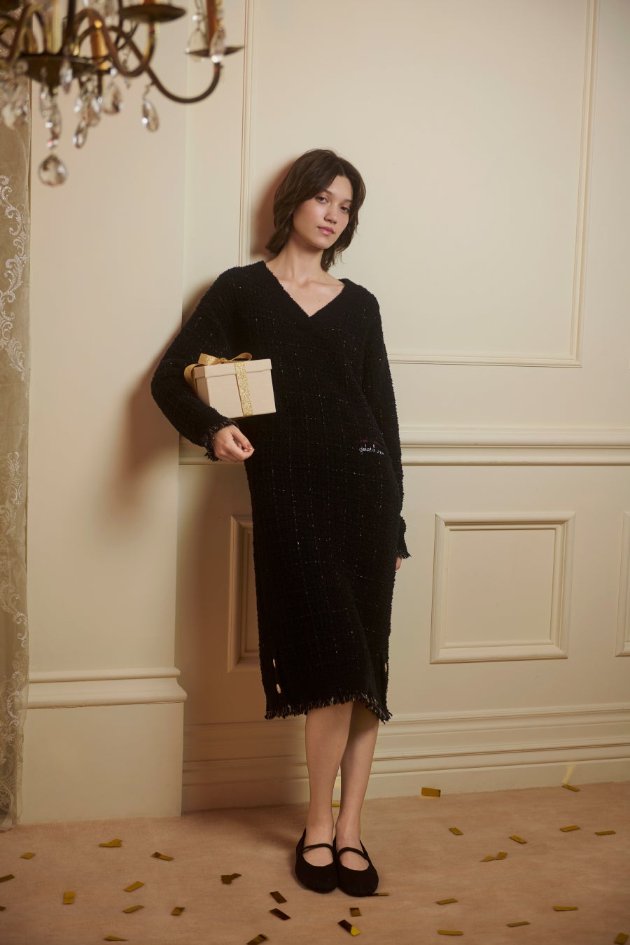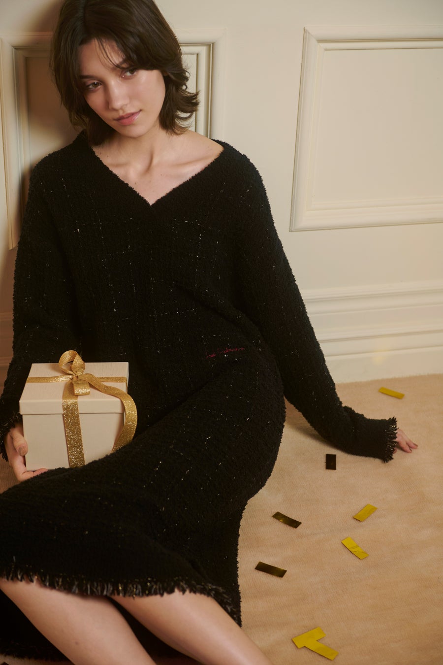 雪のように繊細な輝きのラメ糸など4種類の糸を贅沢に使用したツイード調のニットや、ロブションの料理をイメージしたドット柄のサテンシャツなど、ホリデーシーズンに贈りたい上質なアイテムがラインアップ
