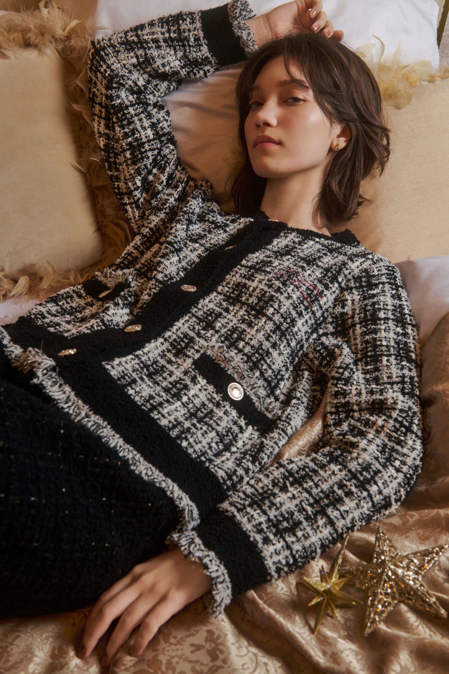 さりげない輝きのラメ糸やゴールド釦を贅沢に使用したツイード調のニットや