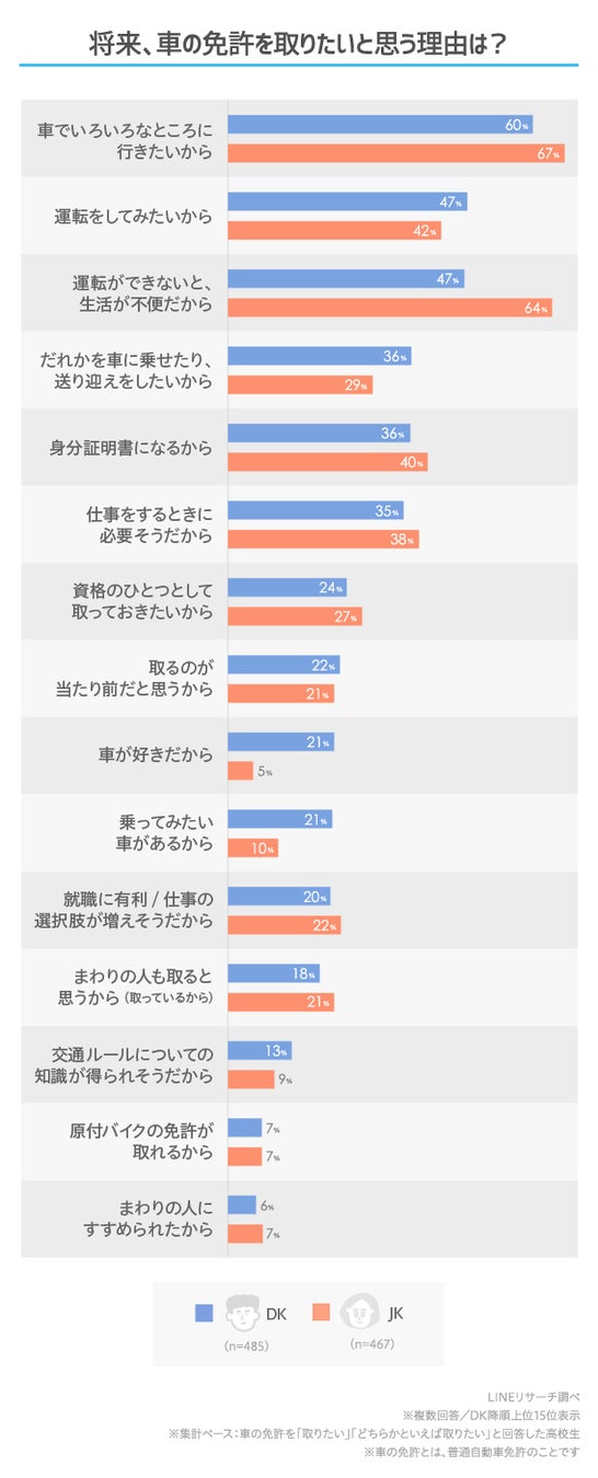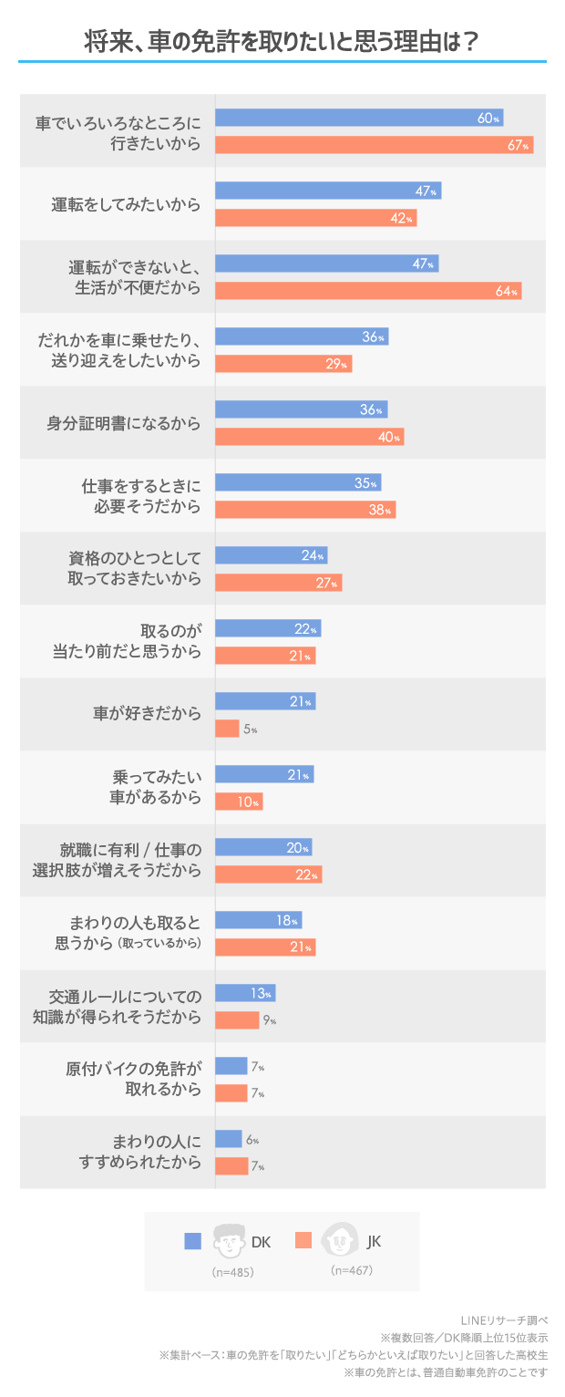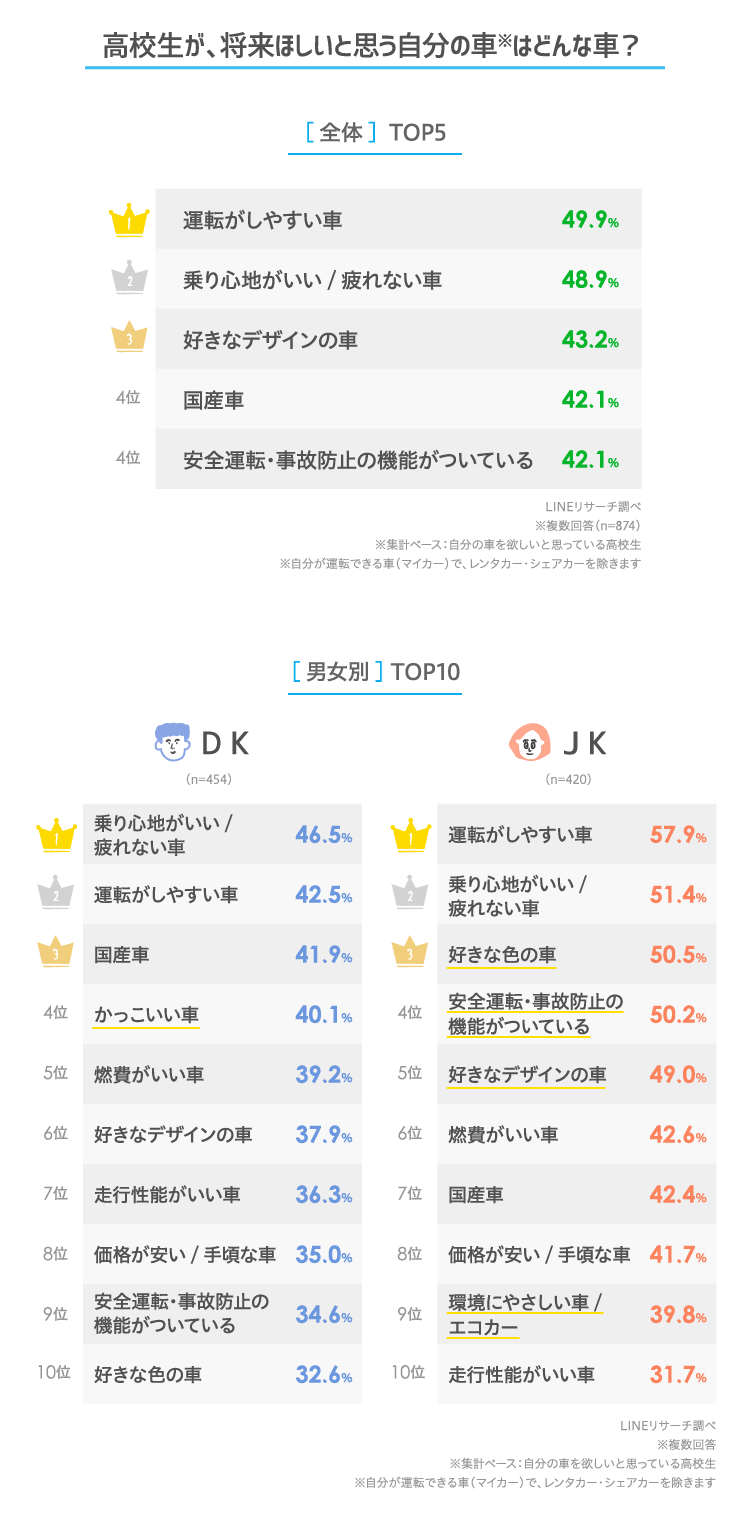 【LINEリサーチ】車の免許を取りたいと思っている高校生は全体で約7割、免許を取りたい理由は「車でいろいろなところに行きたいから」が1位 将来、欲しい自分の車の特徴は男女で異なる結果に