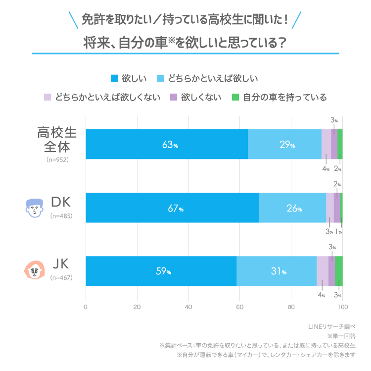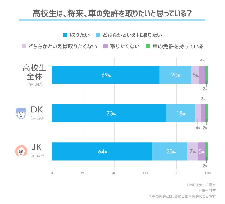 このたびLINEリサーチでは、日本全国の高校生を対象に、車の免許を取りたいと思っている高校生の割合や、免許を取りたい理由などについて調査しましたので、その結果をお知らせいたします。