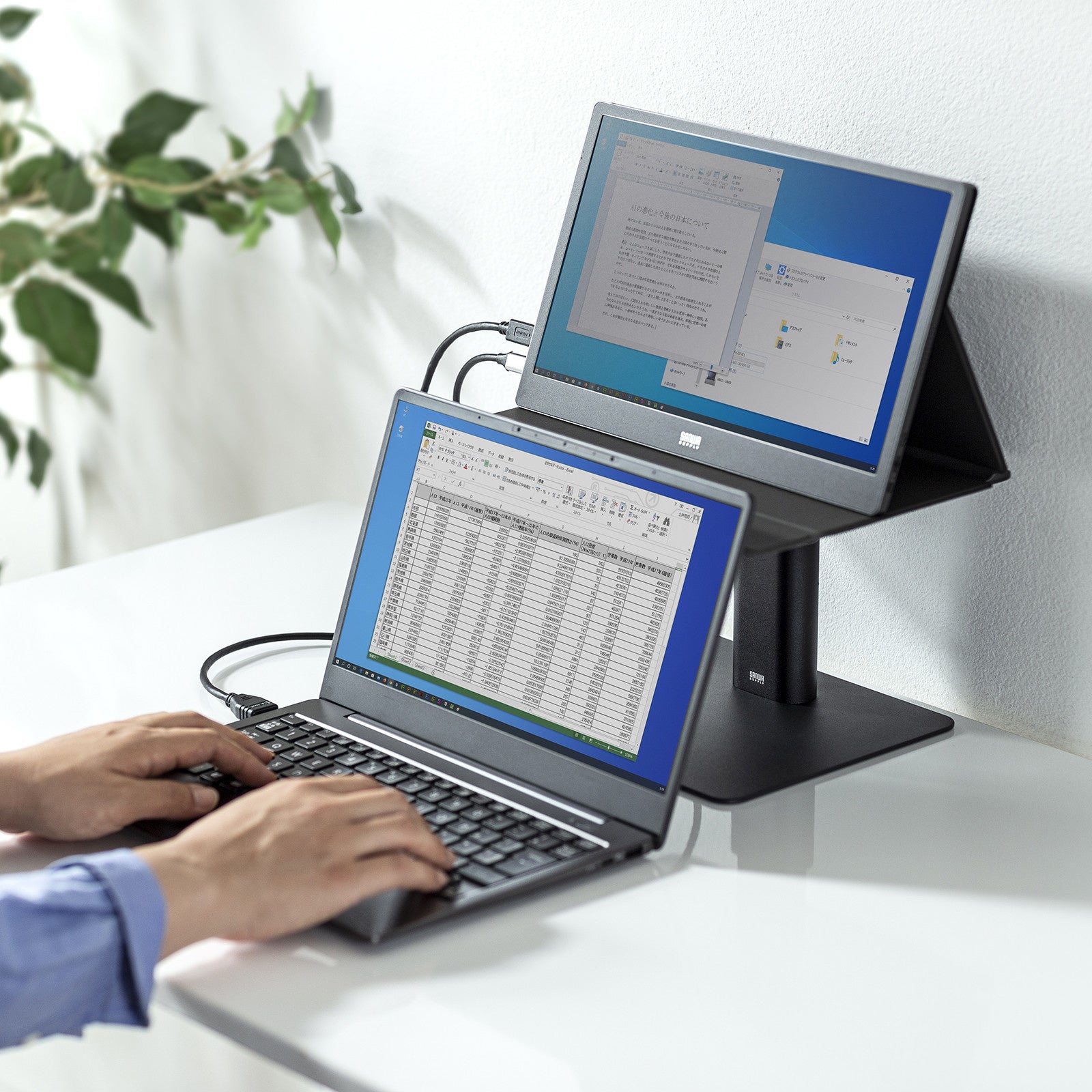 モバイルディスプレイをスタンドに置き、ノートパソコンと上下2画面で使用することもできます。また、大型ディスプレイの横にノートパソコンを置いて画面の高さを合わせて使うことも可能です。