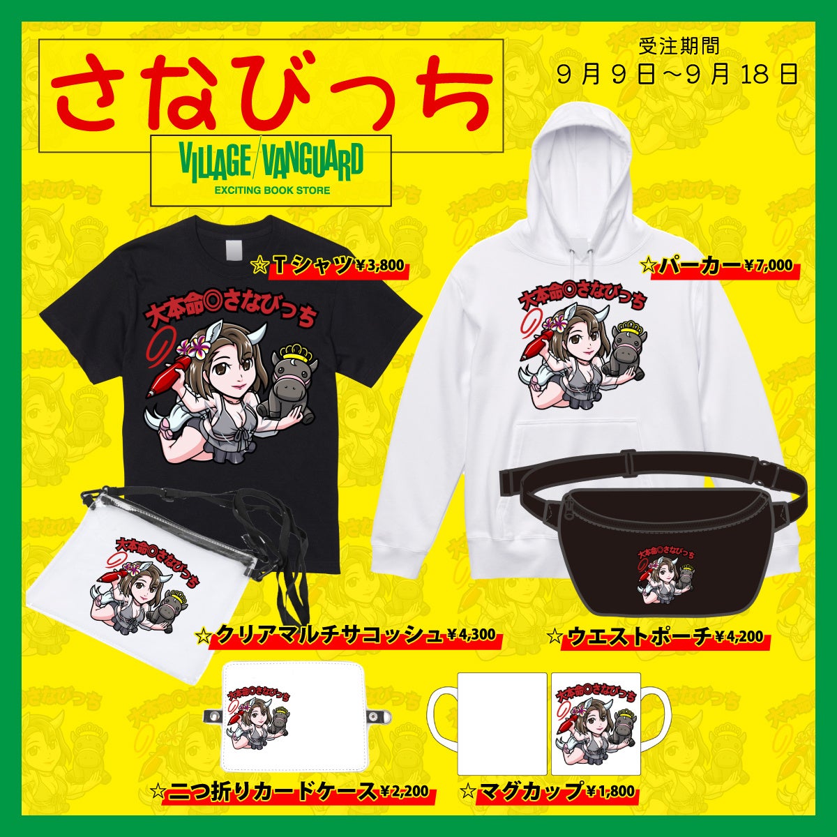 2022年9月9日(金)より、競馬YouTuber【さなびっち】のヴィレッジヴァンガード限定グッズがオンラインストアにて完全受注販売決定!さなびっちさん自身のこだわりもつまった今回のグッズをぜひゲットしてください!期間限定なのでお見逃しなく〜!!