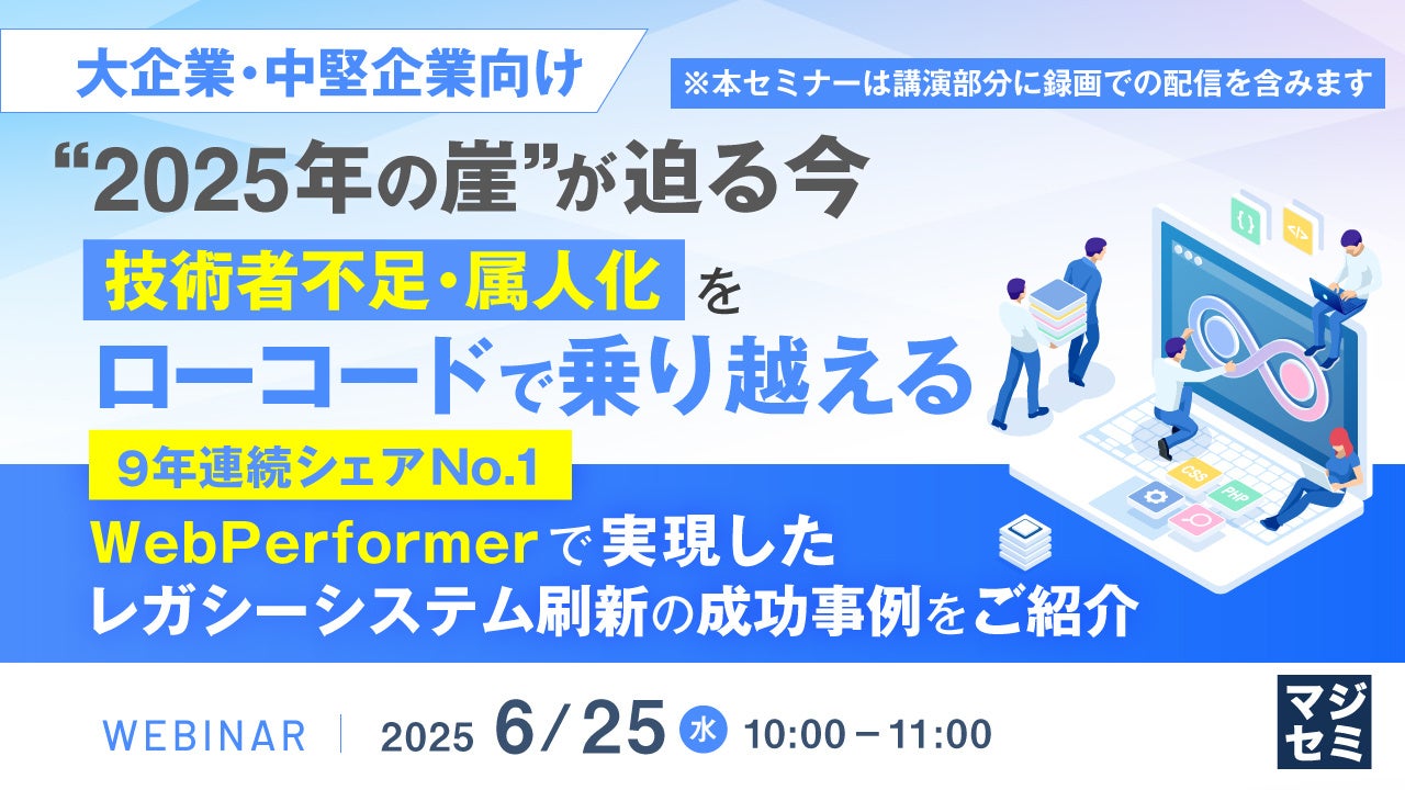 マジセミ株式会社は「【大企業・中堅企業向け】“2025年の崖”が迫る今、技術者不足・属人化をローコードで乗り越える」というテーマのウェビナーを開催します。
