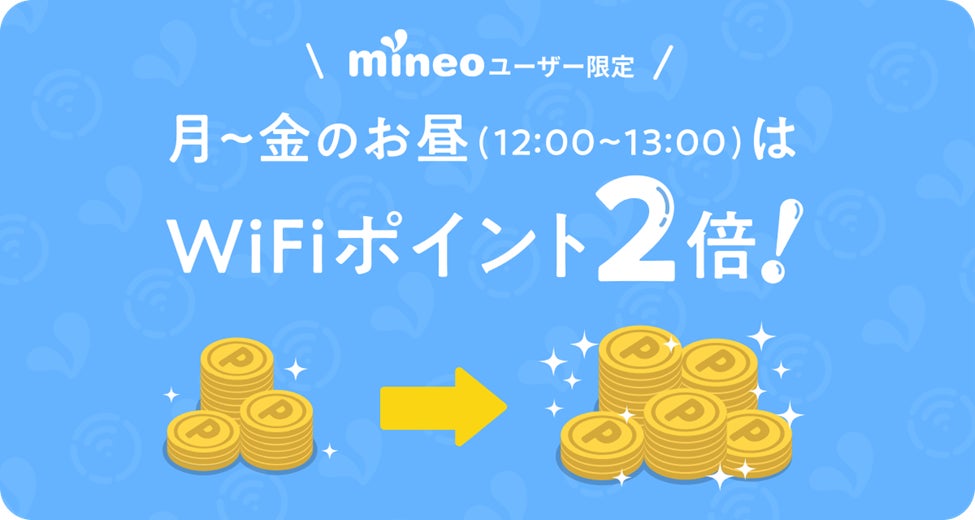 「mineo」ユーザーは、月曜から金曜の昼12時~13時、「タウンWiFi byGMO」の『WiFiポイント』の獲得倍率が2倍に!