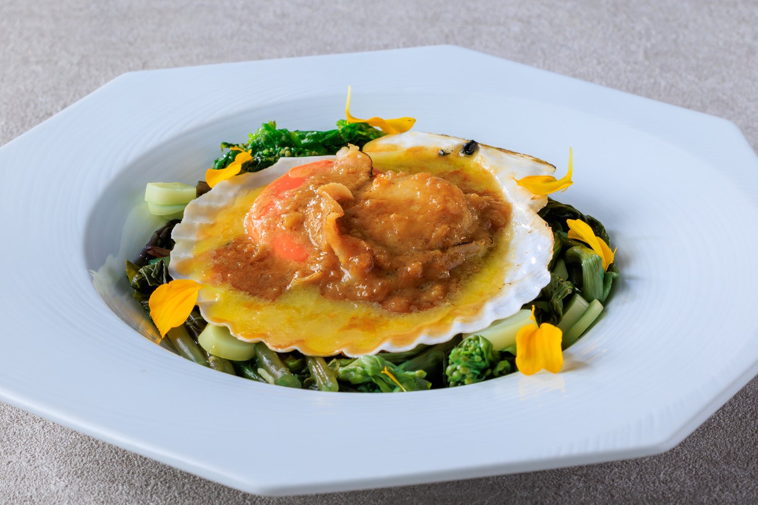 ・帆立のグリル 山菜とバター醤油 柚子胡椒のアクセント