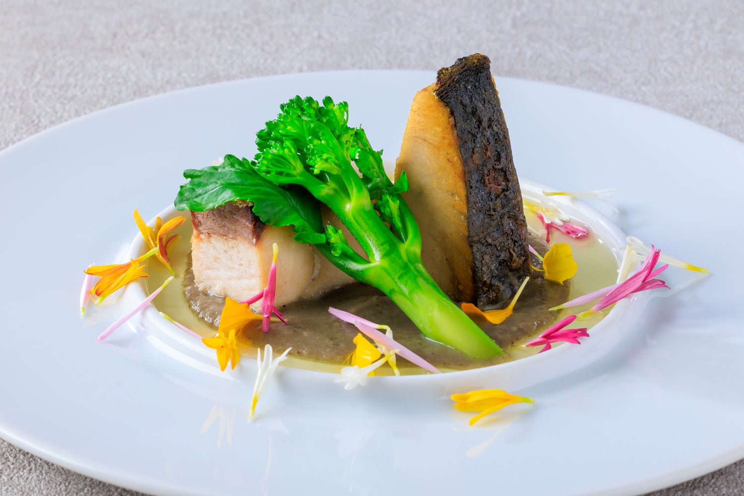 ・鰆のポワレ 牛蒡のブルーテ 花を散りばめて