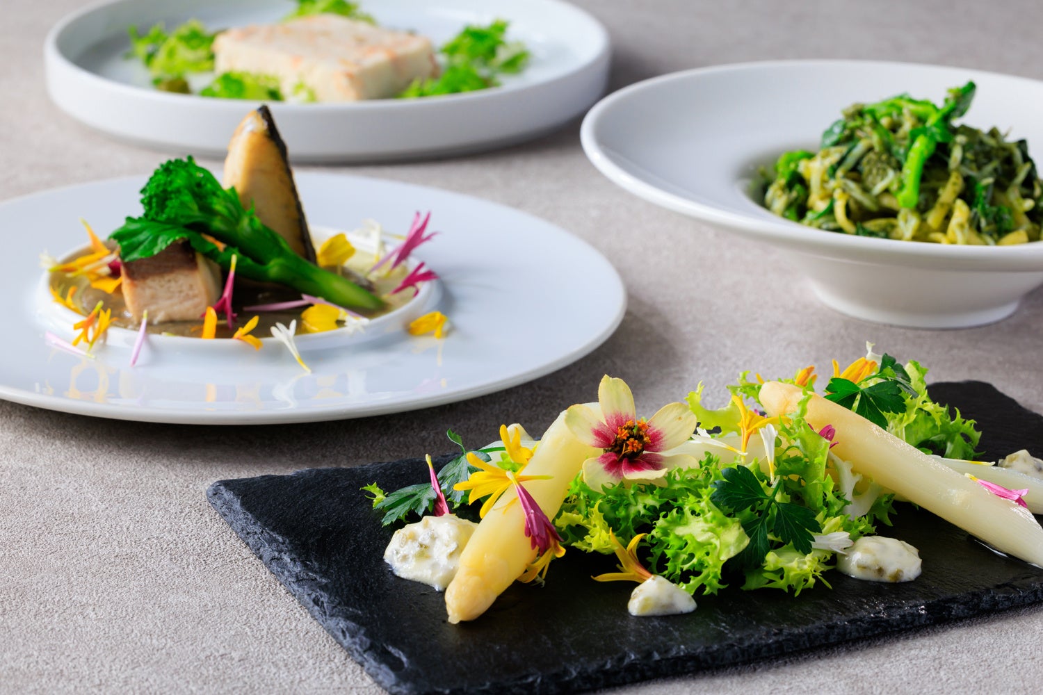柔らかな食感と甘みが魅力のホワイトアスパラガスを、甘酸っぱいスイートレリッシュソースで楽しむ「ホワイトアスパラガスのサラダ仕立て」や、アサリのうまみと桜海老の香りが引き立つ「アサリと桜海老のテリーヌ」のほか、筍などの春野菜とレンズ豆で具だくさんに仕上げた「春野菜とレンズ豆のミネストローネ」、低温調理でしっとり柔らかに焼き上げた仔羊肉をローズマリーの香り豊かなソースと味わう「仔羊のロースト」など、春の味覚満載の期間限定メニューをお楽しみいただけます。