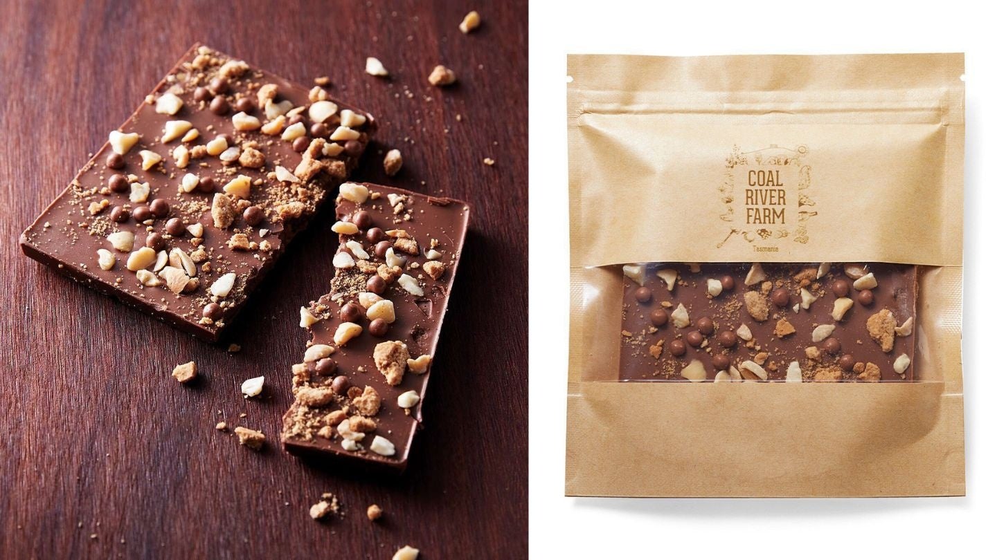 日本で修行したデヴィッドさんがフェリシモのために作ったチョコです。タスマニア産のレザーウッドハニーのビスケットとマカダミアナッツをミルクチョコにトッピング。ほどよい塩味が憎い!