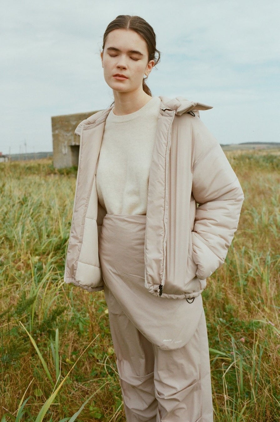 新素材『テックフィルブレスサーモ』は、薄い不織布を何層にも重ねた構造で、柔らかさと膨らみがあり、ダウンよりも保温性に優れる中綿です。