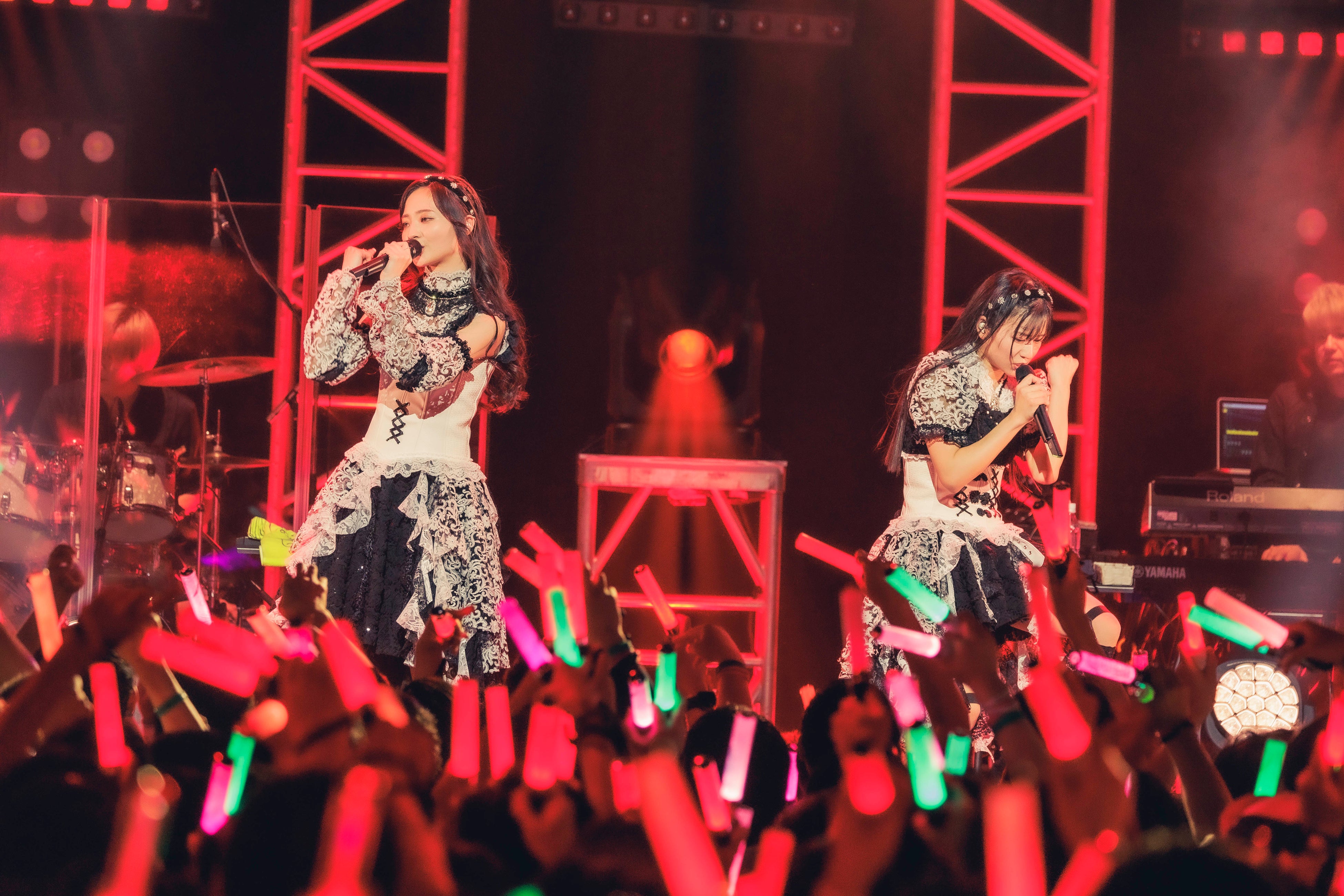 その後「again」「ユニゾン」とテンポ感のある生バンドと相性抜群の楽曲が続く。「ユニゾン」は、クララ、カレンともにステージの左右をダイナミックに移動し、ステージ前方に設置された“お立ち台”でファンを煽るなど、ライブハウスならではの演出により、観客との距離が一気に縮まり、大興奮した来場者からは心からの大きな拍手が贈られた。