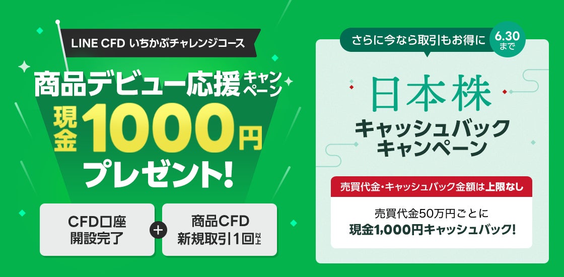 LINE証券株式会社(本社:東京都品川区、代表取締役Co-CEO:正木美雪・米永吉和)は、差金決済取引(以下、CFD取引)サービス「LINE CFD(いちかぶチャレンジコース)」において、「商品デビュー応援キャンペーン」と「日本株 キャッシュバックキャンペーン」を開催いたしますので、お知らせいたします。