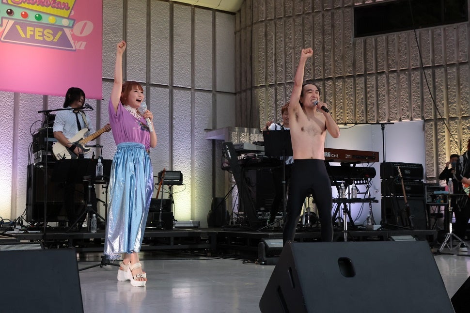 続いて、しょこたんライブではおなじみのバンド<ギザレンジャー>による布袋寅泰「スリル」の演奏が始まると、チャンネル登録者数370万人超えを誇る大人気YouTuberにして、お笑い芸人である江頭2:50が登場。お馴染みのポーズを繰り出しながらハンドマイクで熱唱すると、観客はいきなり総立ちとなり、会場のテンションは一気に上昇。パフォーマンス後に大きな拍手を受けた江頭は床に突っ伏し、「おれ、芸人だぜ。こんなすごいところで1人で歌うなんて罰ゲームだよ」と嘆きながらも、「しょこたんと一緒に歌いたい」と、中川を呼び込み、THE BLUE HEARTS「人にやさしく」をデュエット。