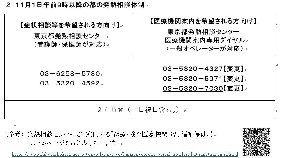 11月1日(火曜日)午前9時から、医療機関案内に特化した、「東京都発熱相談センター 医療機関案内専用ダイヤル」の電話番号を変更しますのでお知らせします。
