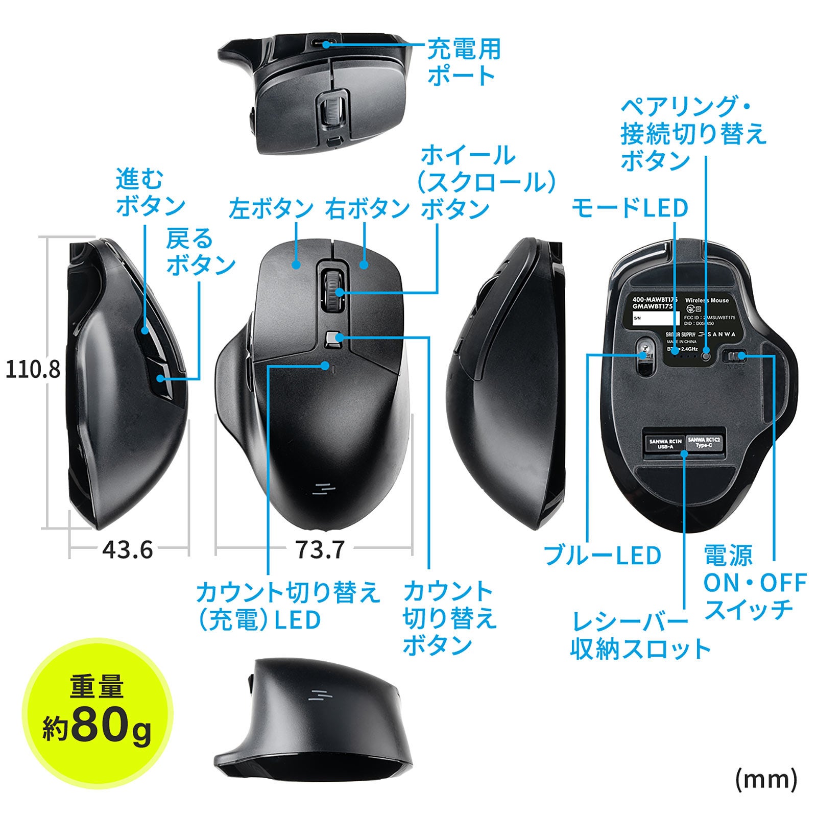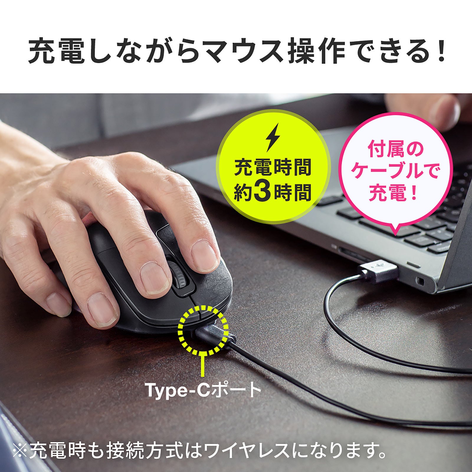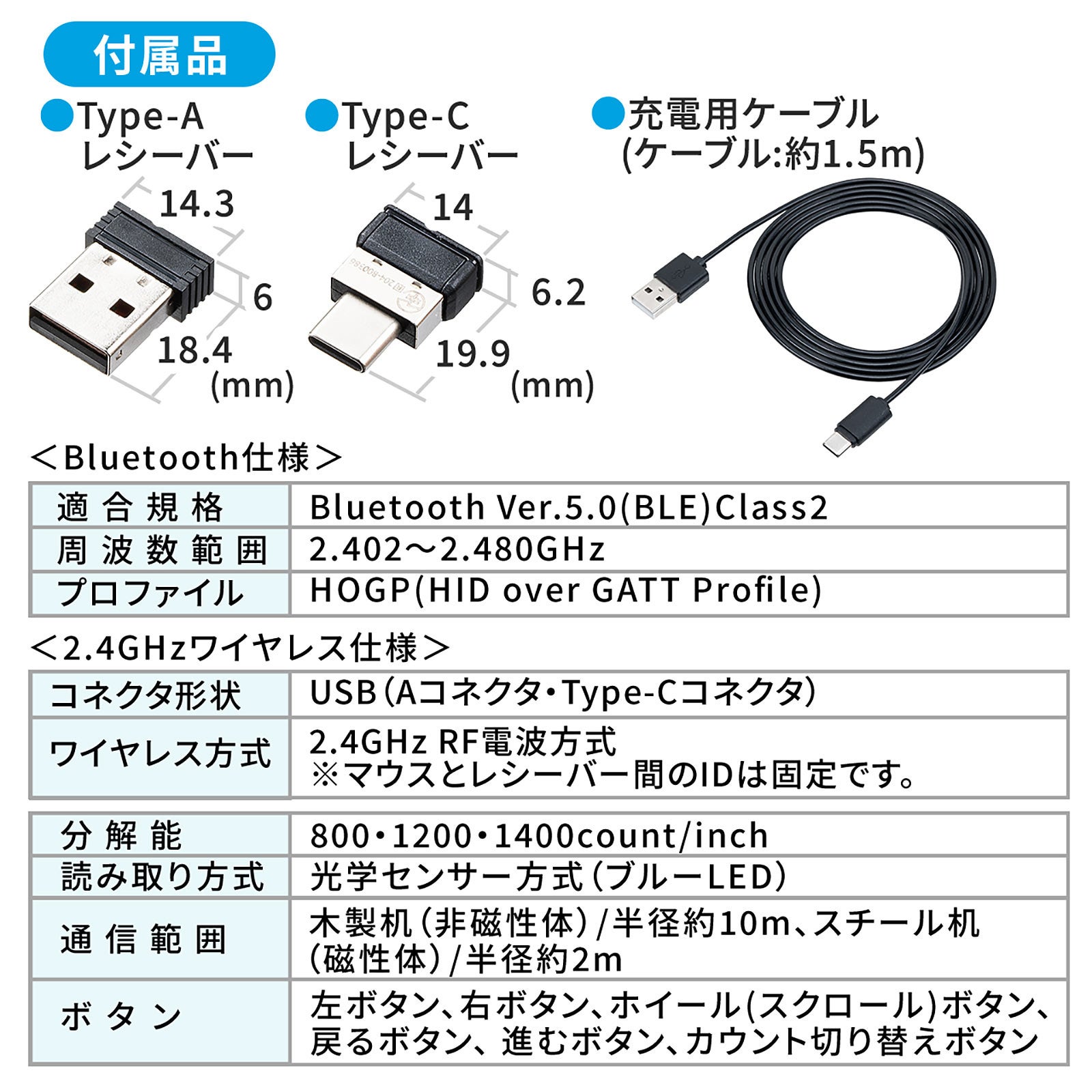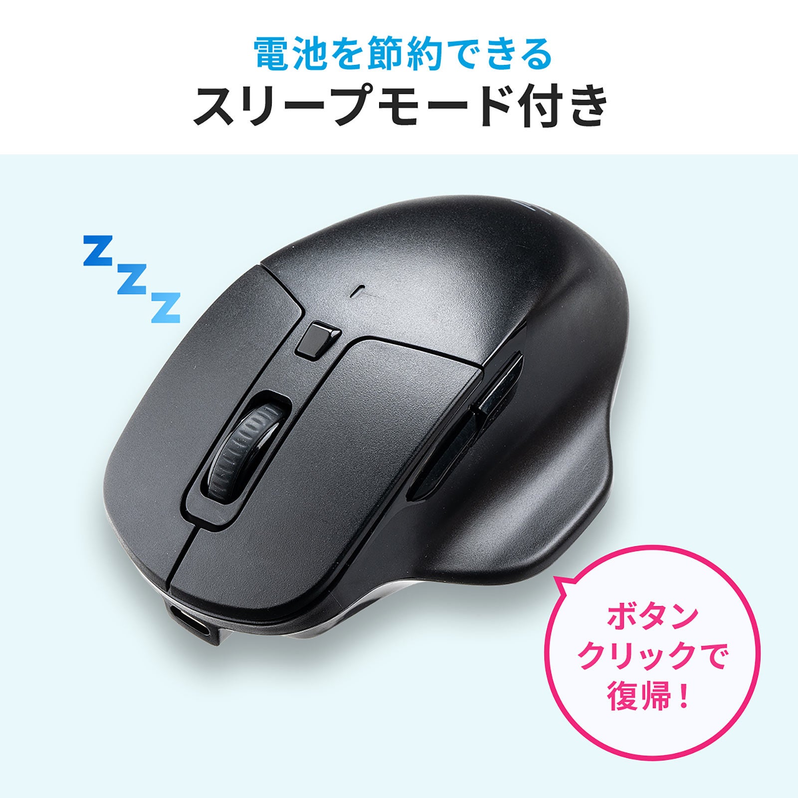 本製品は、Bluetoothおよび専用レシーバーによるワイヤレス接続に対応したBluetoothマウスです。Bluetooth接続×2台、USB Aレシーバー、USB Type-Cレシーバーの最大4台の機器を切り替えて使用できます。用途に合わせてパソコンやタブレットを使い分けている方におすすめです。