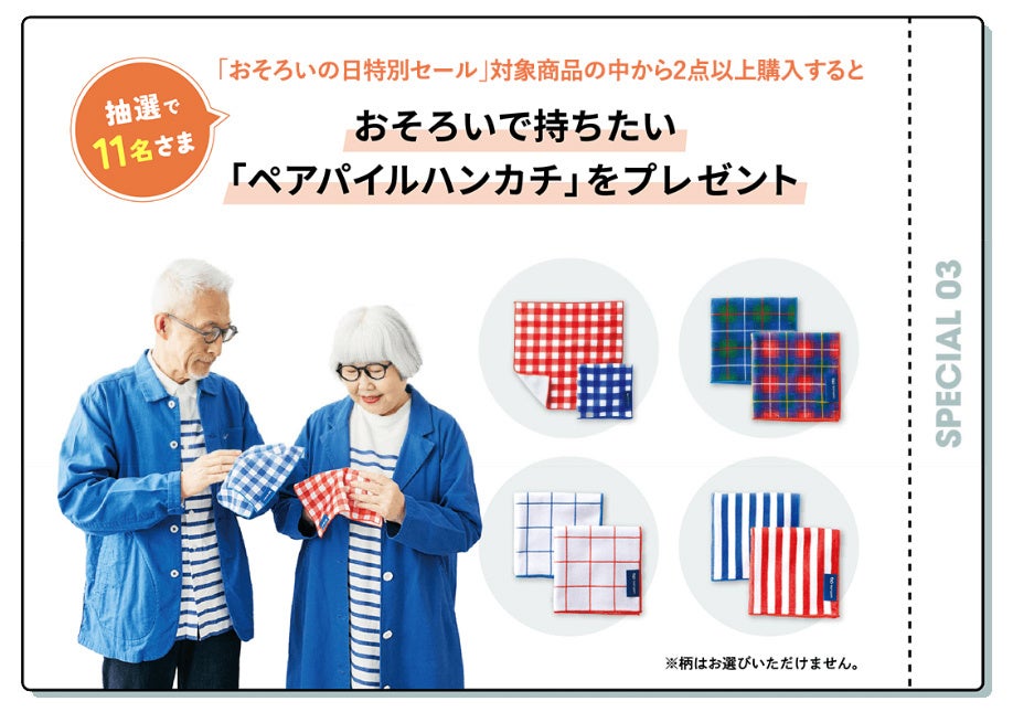 3.対象商品を2点以上お買い上げの方の中から抽選で11名さまに「ペアパイルハンカチ」をプレゼント