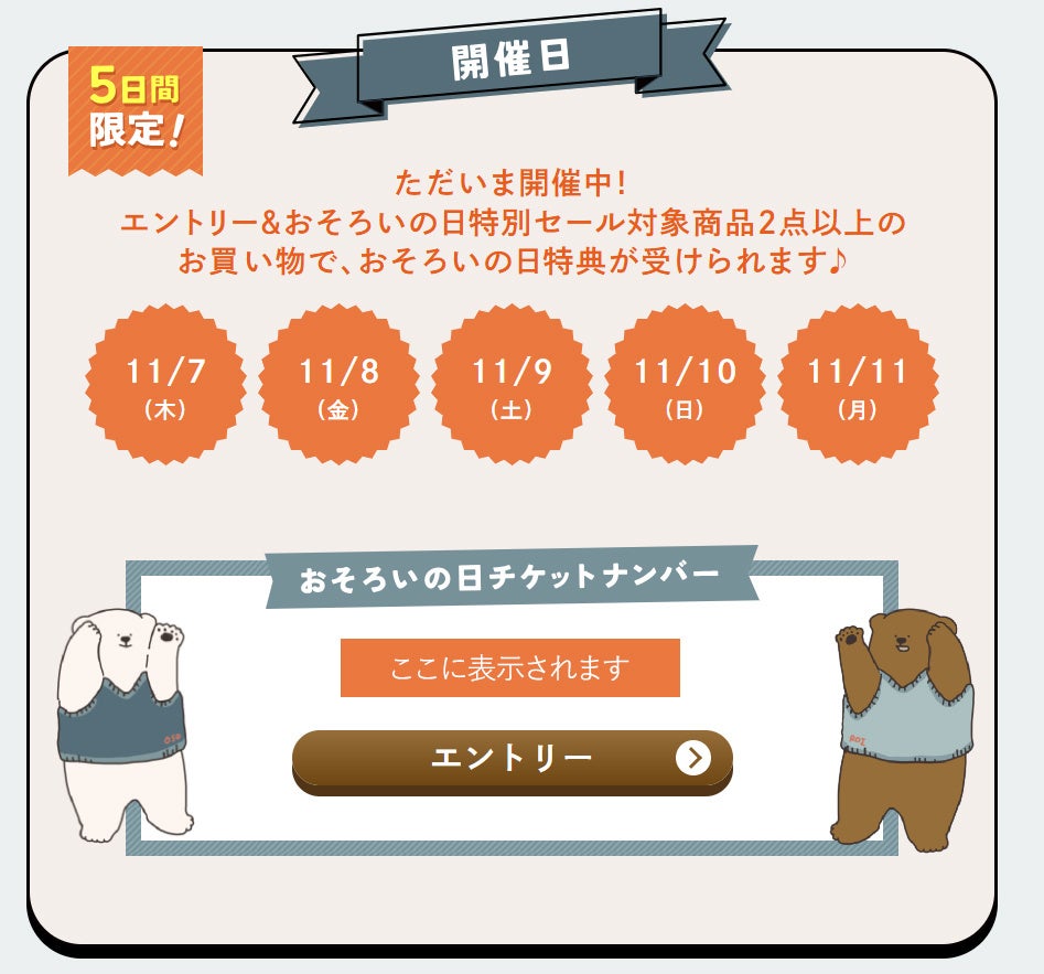 1.エントリーの上、『おそろいの日特別セール』対象商品の中から2点以上購入すると、11%OFFに
