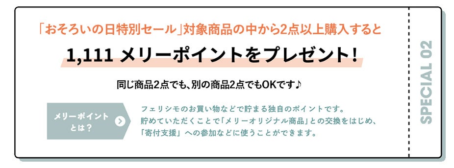 フェリシモは、記念日「おそろいの日」を前に「#おそろいの日特設サイト」を公開、おそろいを楽しむキャンペーンを開催します。11月11日の記念日「おそろいの日」をきっかけに、記念日に限らず“#おそろい”の日々を楽しんでほしいとの思いで開催します。キャンペーンの目玉のひとつは、エントリー&おそろいセール対象商品を2点以上申し込むと11%OFFになる『おそろいの日特別セール』です。さらに、同キャンペーンのセールから2点以上購入すると、全員にもれなくお買い物ポイント「フェリシモメリー」1,111ポイントもらえるほか、内11名に「ペアパイルハンカチ」をプレゼントします。開催期間は11月7日00:00~11日23:59までです。「#おそろいの日」は、誰かと好きなテーマやアイテムで“おそろい”を楽しむだけでHAPPYになることができるイベントです。「#おそろいの日特設サイト」では、さまざまな情報を発信しており、“おそろい”がテーマのSNS投稿にプレゼントを贈る「#おそろいの日大賞」や、おそろいの日を楽しむ人を応援するフェリシモ以外の事業者の取り組み事例募集と紹介も行っています。