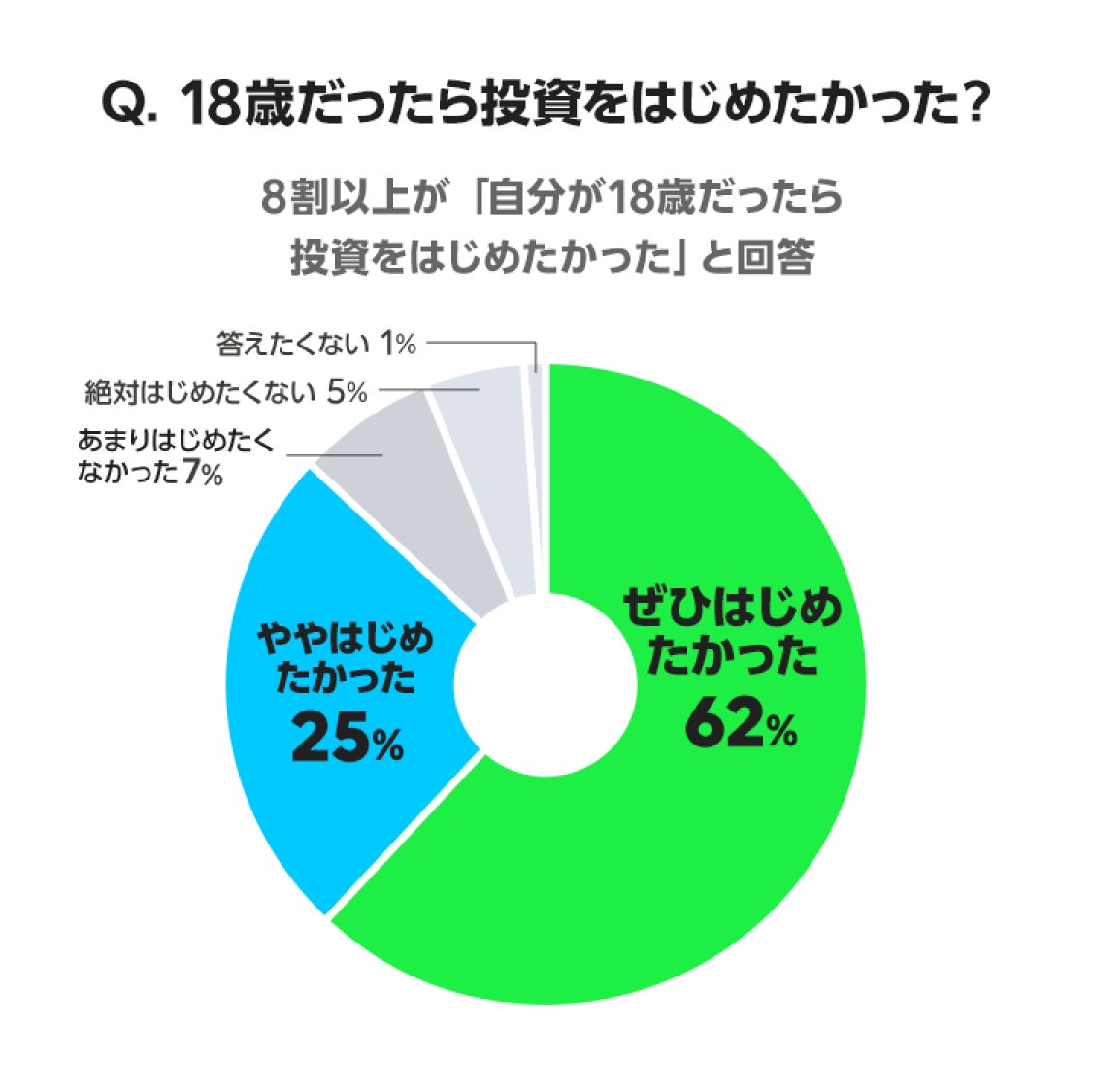 ご自身が18歳の時に今の時代のように手軽に投資が始められるとしたら、「ぜひ始めたかった」62%、「やや始めたかった」25%と87%の方が「はじめたかった」と回答しました。