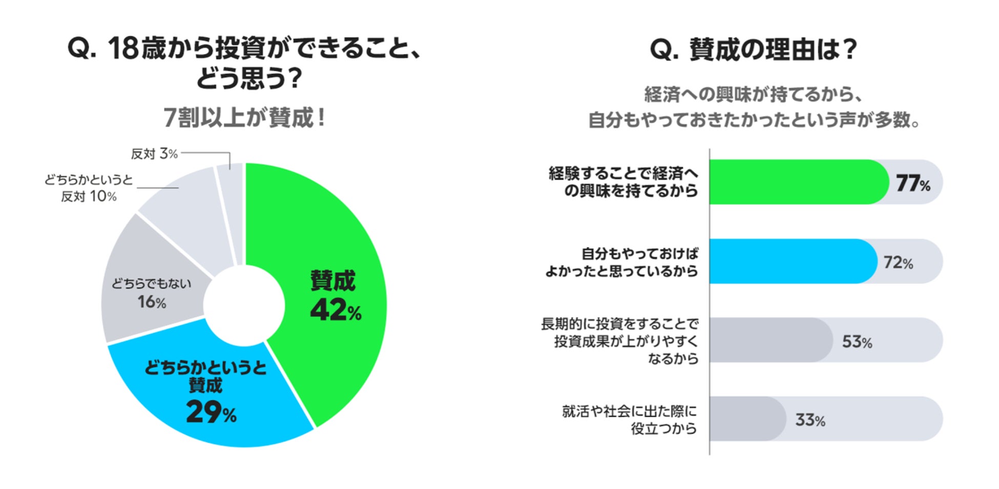 20歳以上は、18歳から投資ができることに71%が賛成、経済への興味が持てるからが理由に18歳から投資ができることについては、「賛成」が42%「どちらかというと賛成」が29%で71%が「賛成」という結果となりました。理由としては、「経験することで経済への興味を持てるから」77%、「自分もやっておけばよかったと思っているから」72%、「長期的に投資をすることで投資成果が上がりやすくなるから」53%という結果になりました。