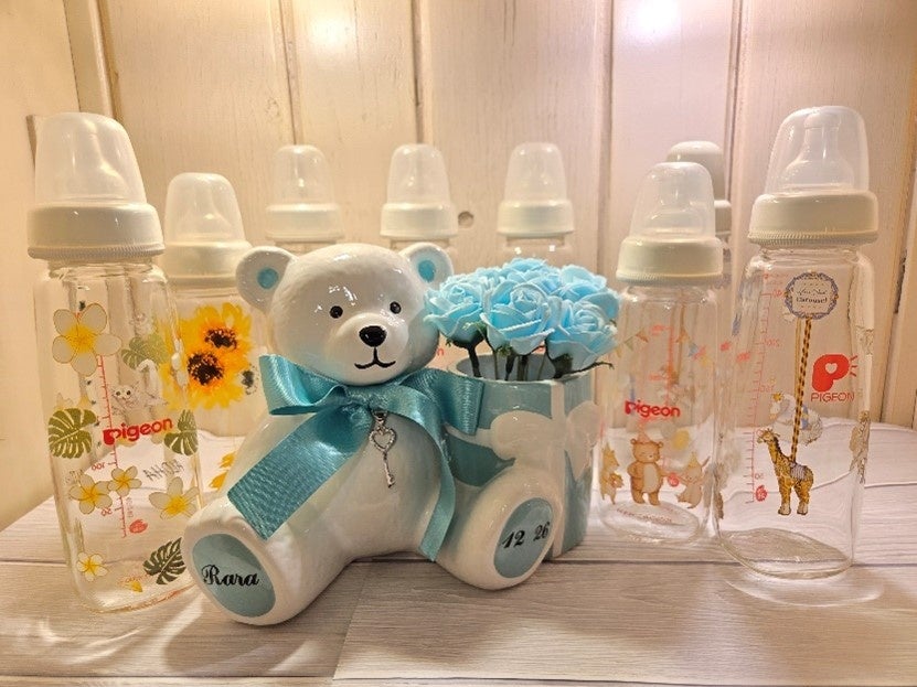 やさしい表情のラッキーベアは、お子さまの健やかな成長を願いながら一つひとつ丁寧につくり上げた陶器のインテリアアイテム。お名前やイニシャルを入れて、特別な贈り物にもぴったりです。また、かわいい絵柄やお名前を施したガラス哺乳瓶は、使うたびに笑顔が広がるオリジナルデザイン。思い出に残るギフトとしてもおすすめです。大切な瞬間に、心を込めた特別なアイテムをお届けします。ぜひ会場でお手に取ってご覧ください。