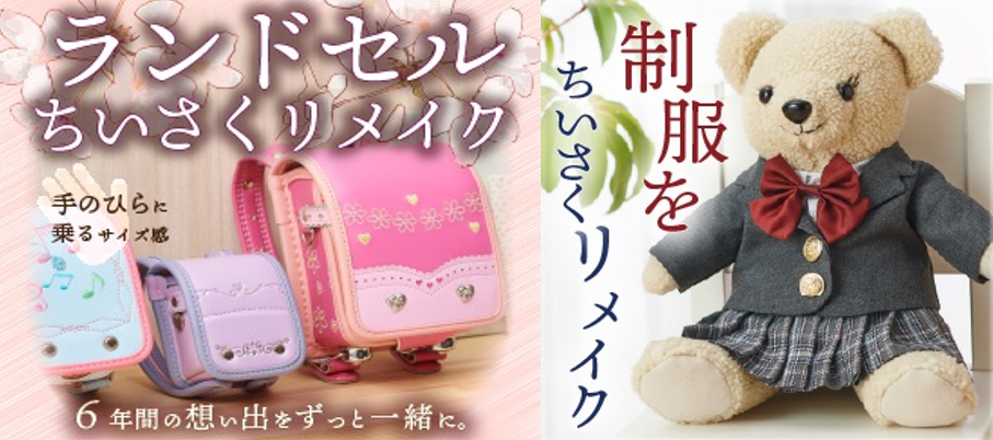 小学校の想い出が詰まったランドセルを「お財布」や「壁掛け時計」へリメイクする「ランドセルリメイク」や、学生生活の想い出が詰まった制服をミニチュアサイズへリメイクする「制服リメイク」など、大切な想い出をいつまでもそばに置いておける特別なものへリメイクするサービスを提供します。卒業シーズンのプレゼントにも最適です。