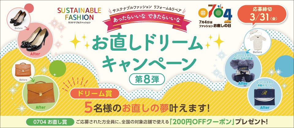 お気に入りのもの、大切なものをお直し修理、リメイクして生まれ変わらせる「サステナブルファッション」への取り組みとして、第8弾「お直しドリームキャンペーン」を開催し「お直しの夢」を募集しています。