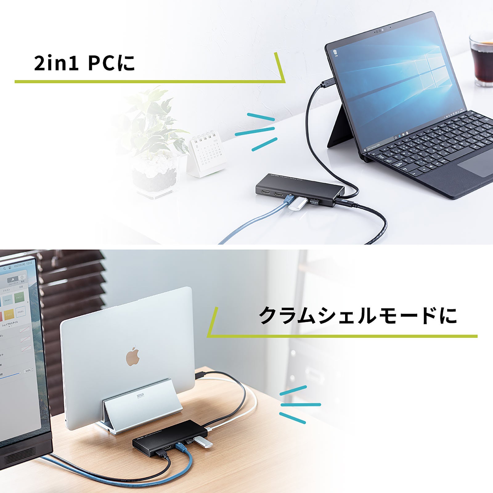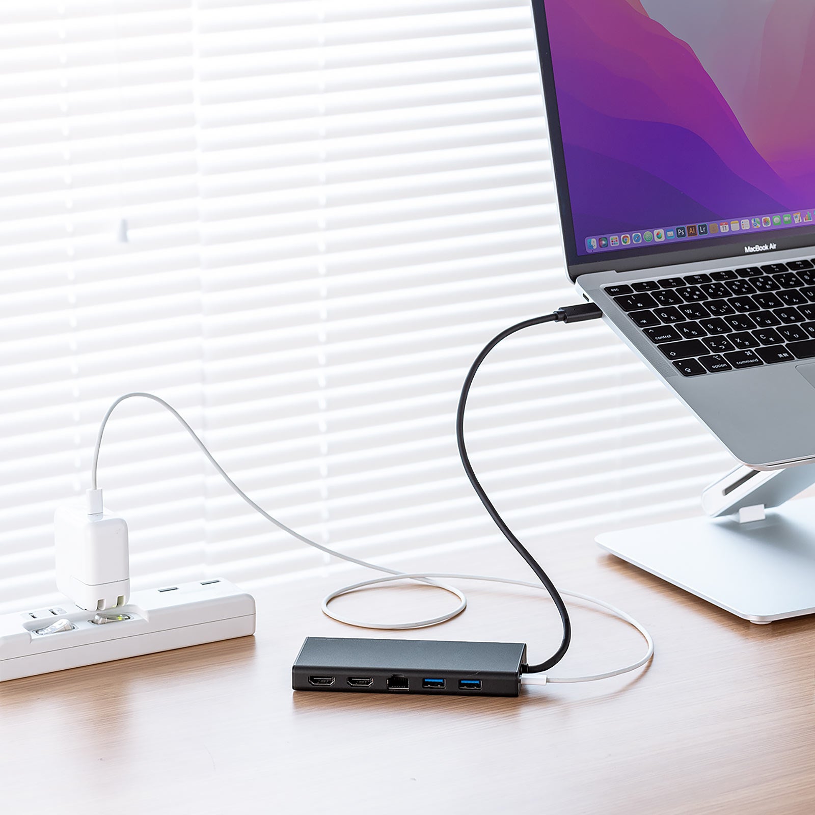 USB Type-Cでの「USB Power Delivery(USB PD 60W)」に対応しており、 接続したパソコンへの給電も本製品経由で可能です。