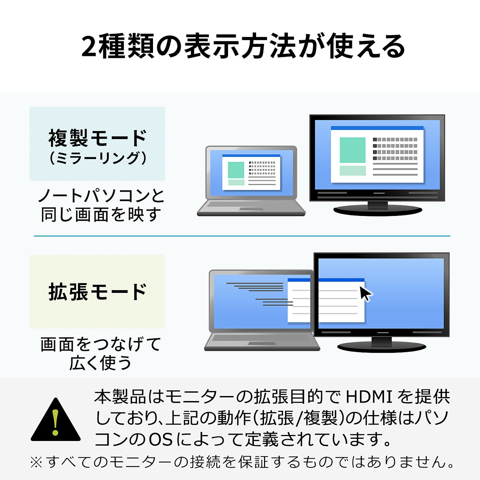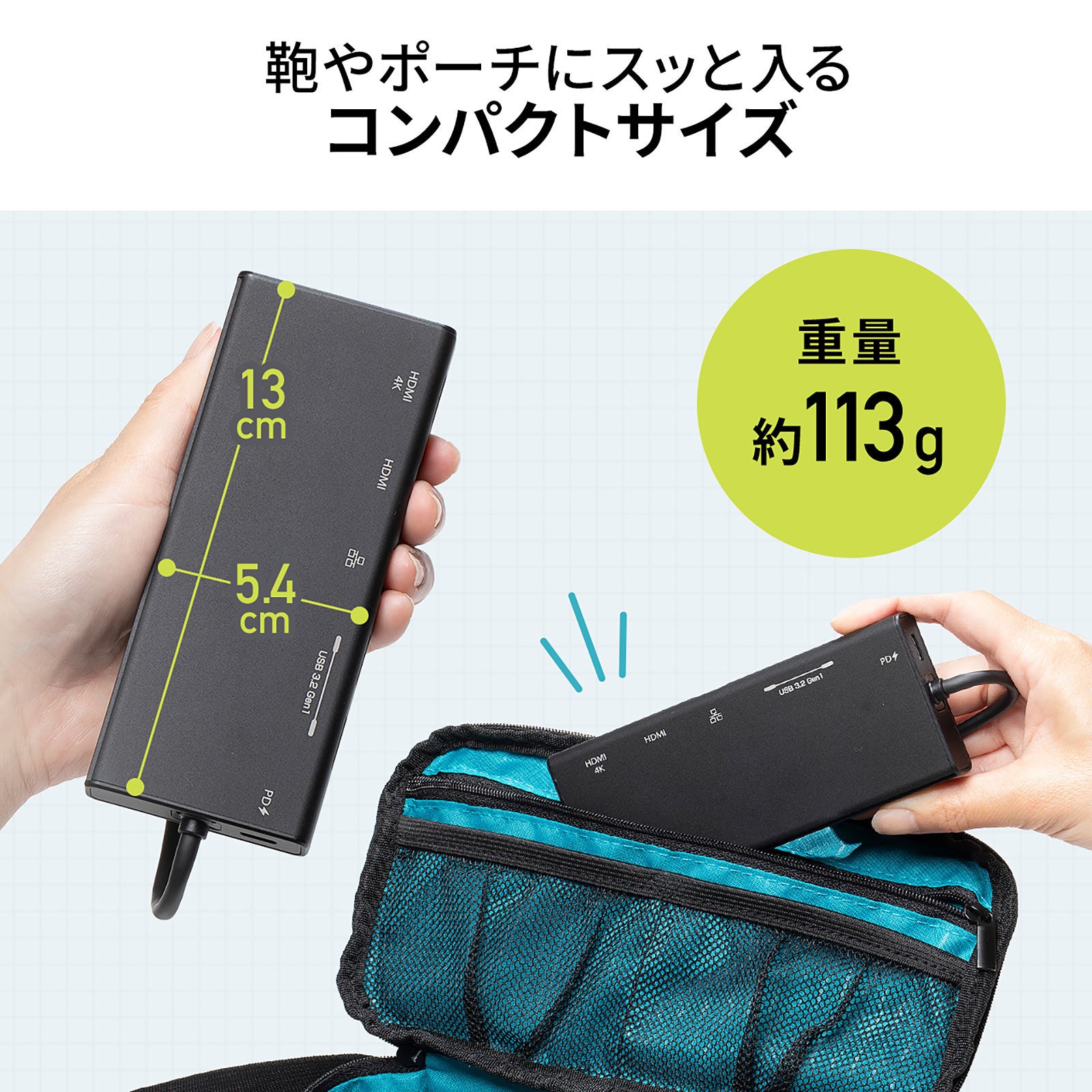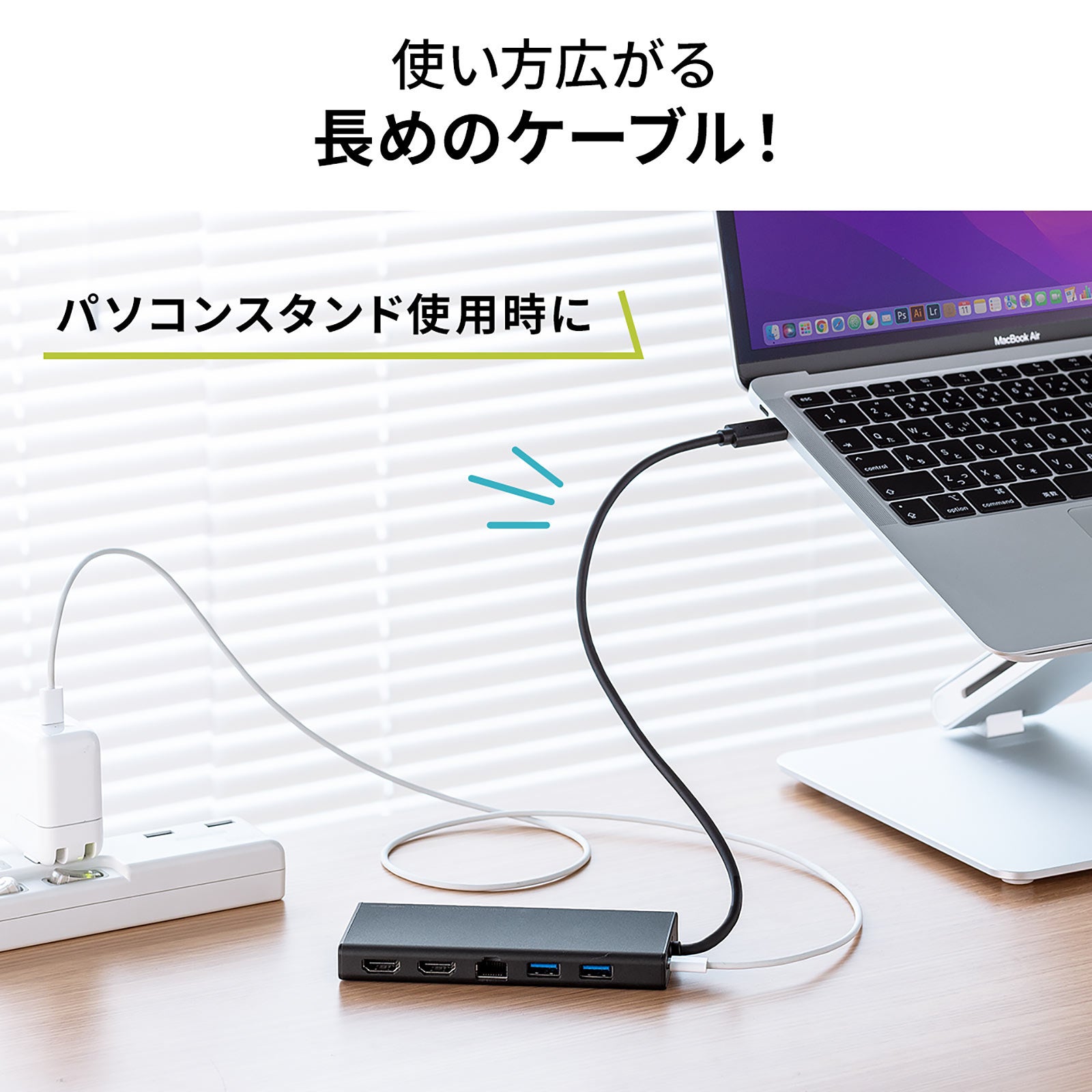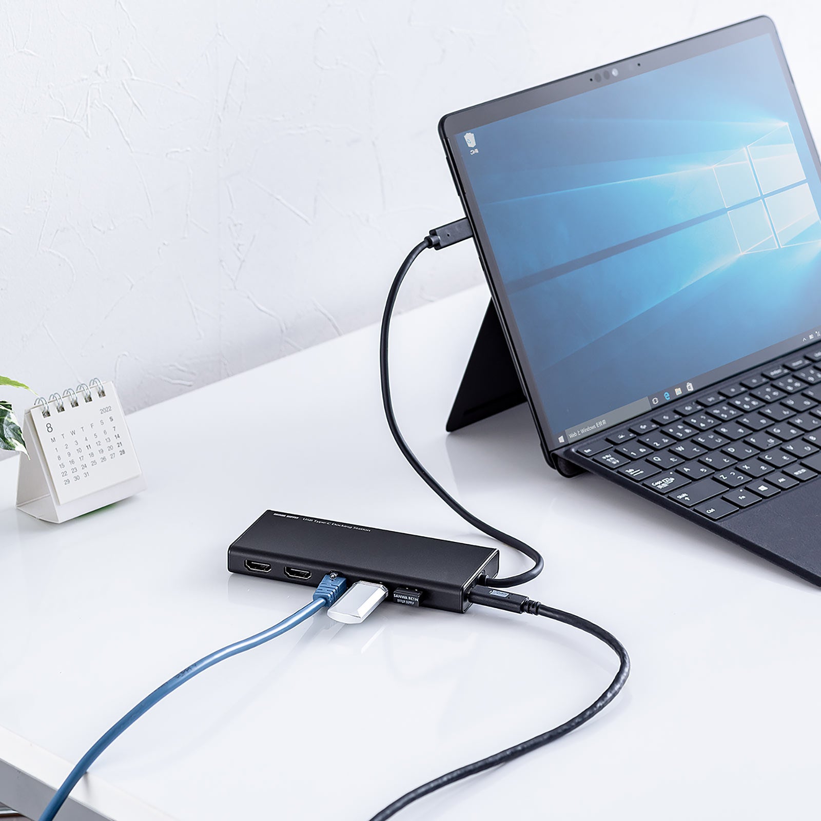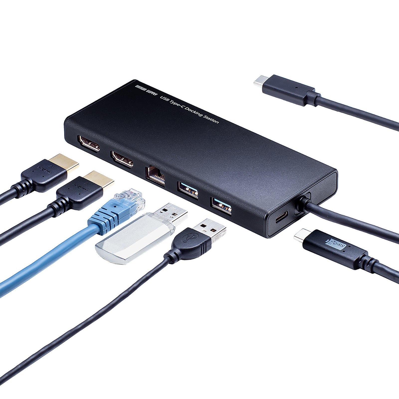 本製品は、Type-Cケーブル1本でHDMIディスプレイ×2、USB機器×2、有線LANの拡張と接続ができるUSB Type-Cモバイルドッキングステーションです。