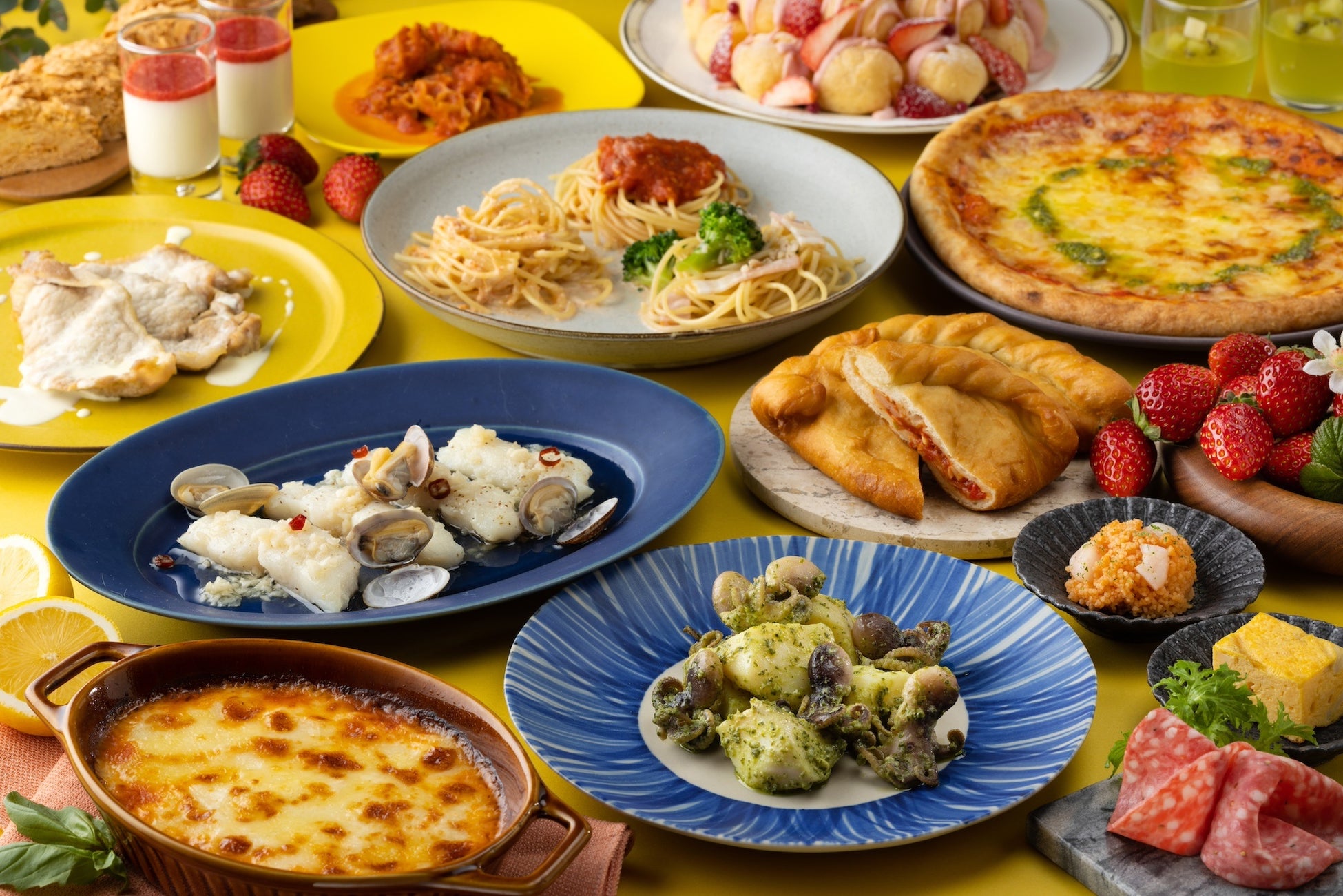 第二弾は『春のイタリアン』をテーマにした料理やデザートを食べ放題で提供いたします。イタリアンの王道メニューであるピザは、自家製トマトソースを使用したマルゲリータや4種のチーズを使ったクワトロ・フォルマッジに加え、トマトソースとチーズが入った揚げピザもご用意。リゾットは、グラナ・パダーノ チーズボウルで和えるチーズリゾットをお客様の前で仕上げます。パスタコーナーでは、トマトソース・オイルソース・クリームソースの3種のソースをお好みでかけてお召しあがりいただけます。デザートには「いちごのズコット」や「パンナコッタ ベリーのソース」など、いちごデザートのほか「ビスコッティ」「ティラミス」などのイタリアンドルチェもラインアップします。フレッシュいちごはそのままでも、練乳やチョコレートファウンテンにディップしてもお楽しみいただけます。春の訪れを感じるひとときをお過ごしください。