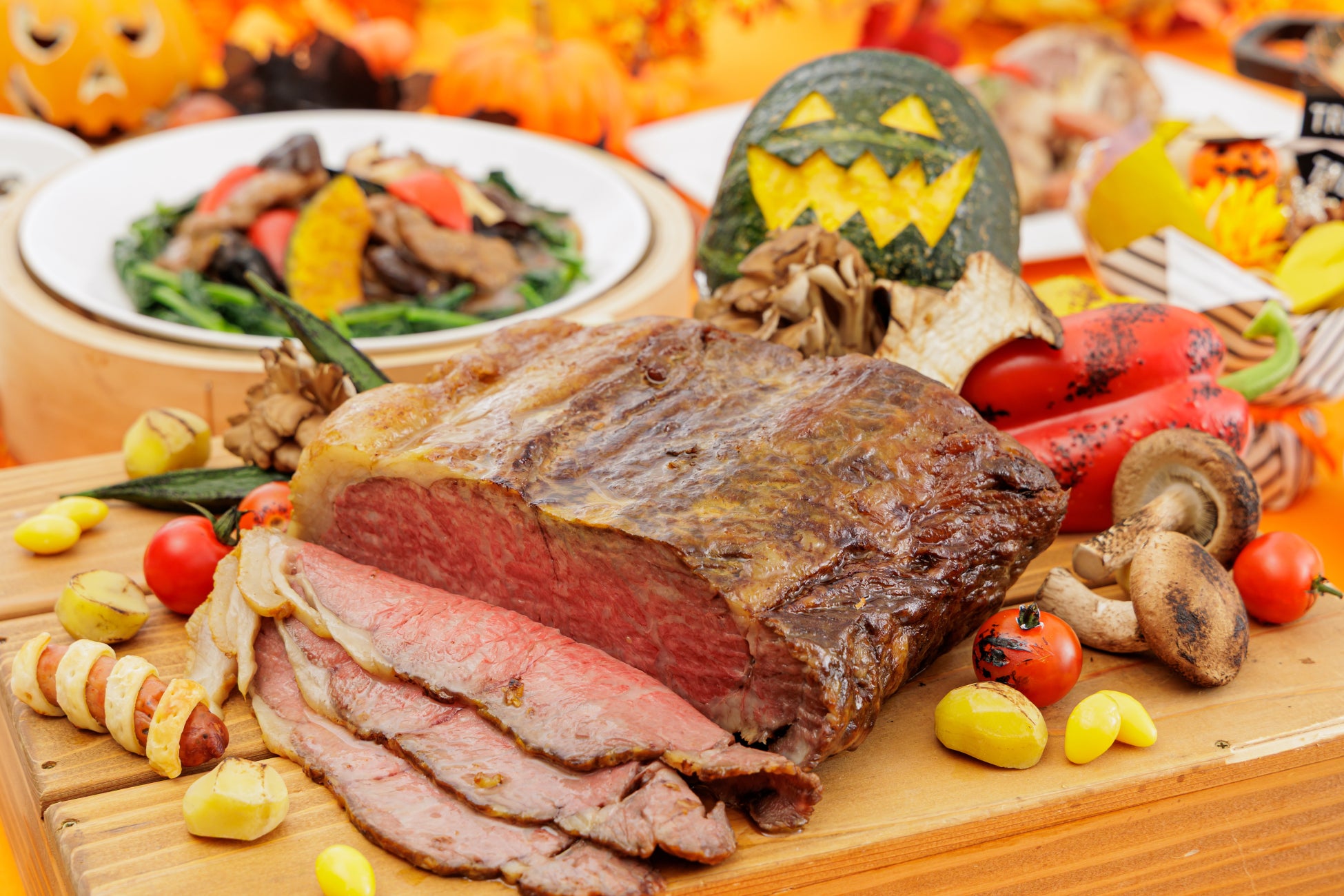 中でも「国産牛のローストビーフ」は、ライブキッチンにてお客様のご注文を受けてから一枚ずつ丁寧にカットしてご提供。そのほかにも、ブラックカレーやハロウィーン風ブラックパスタ、牛肉と茸の煮込み、ローストポークのメープル醤油焼き、サーモンの茸ソースソテーに加え、葡萄と林檎のブルーチーズ和え 蜂蜜添えなど味覚にも彩りにもこだわったメニューをご用意しております。