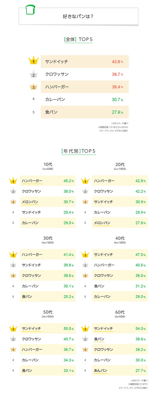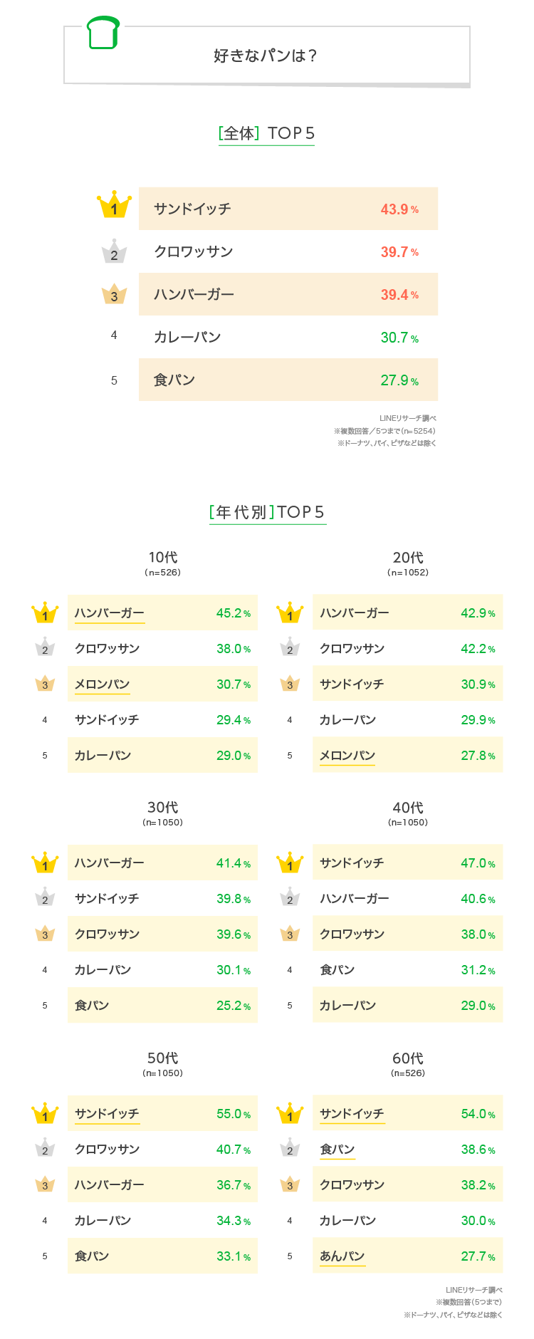 全体TOPは「サンドイッチ」で4割超。2~3位は僅差で「クロワッサン」「ハンバーガー」が4割弱で続きます。4位は「カレーパン」、5位は「食パン」がランクイン。