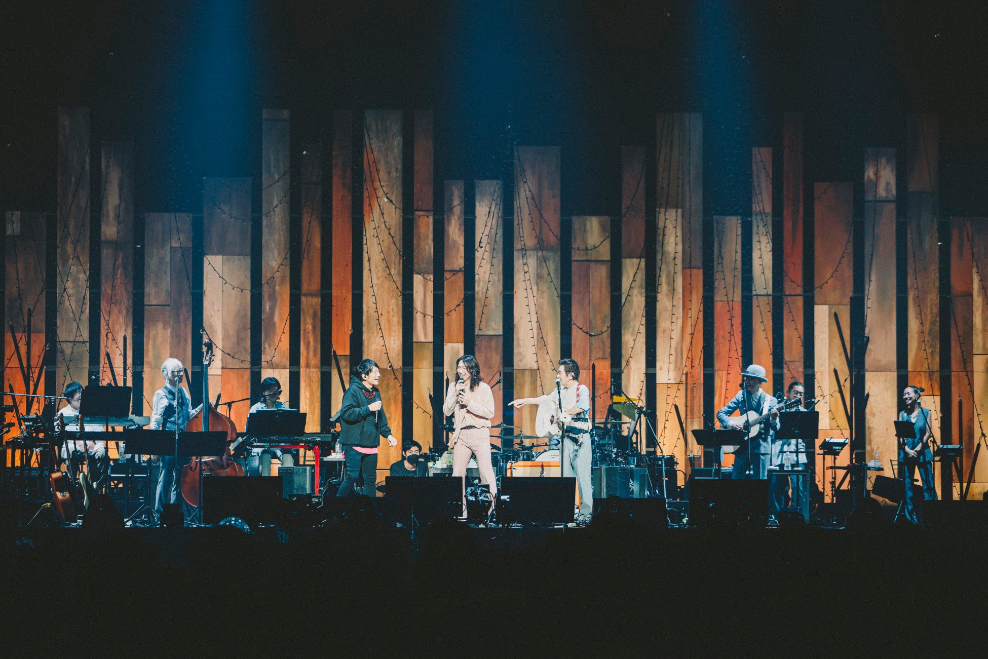 鳴り止まない拍手に応えるように、アンコールが始まると、まさかの桑田佳祐、あいみょん、桜井和寿、竹内まりや、原 由子、吉井和哉(五十音順)の全ゲストが登場!「軽音楽サークルでは、必ずシングアウトをいっしょにする通例になってます。シングアウト!」と、フォークの原点とも言えるママス&パパスの「California Dreaming (夢のカリフォルニア)」を全員で熱唱し、「今日の日はさようなら」を観客も含めて会場全体で合唱。夢のようなひと時は、あっという間に過ぎ、ゲストの5人が舞台を去ると、イベントの発案者である桑田佳祐が自身のソロナンバー「祭りのあと」を披露し、合計29曲、約3時間におよんだ奇跡のイベントの幕を下ろしました。
