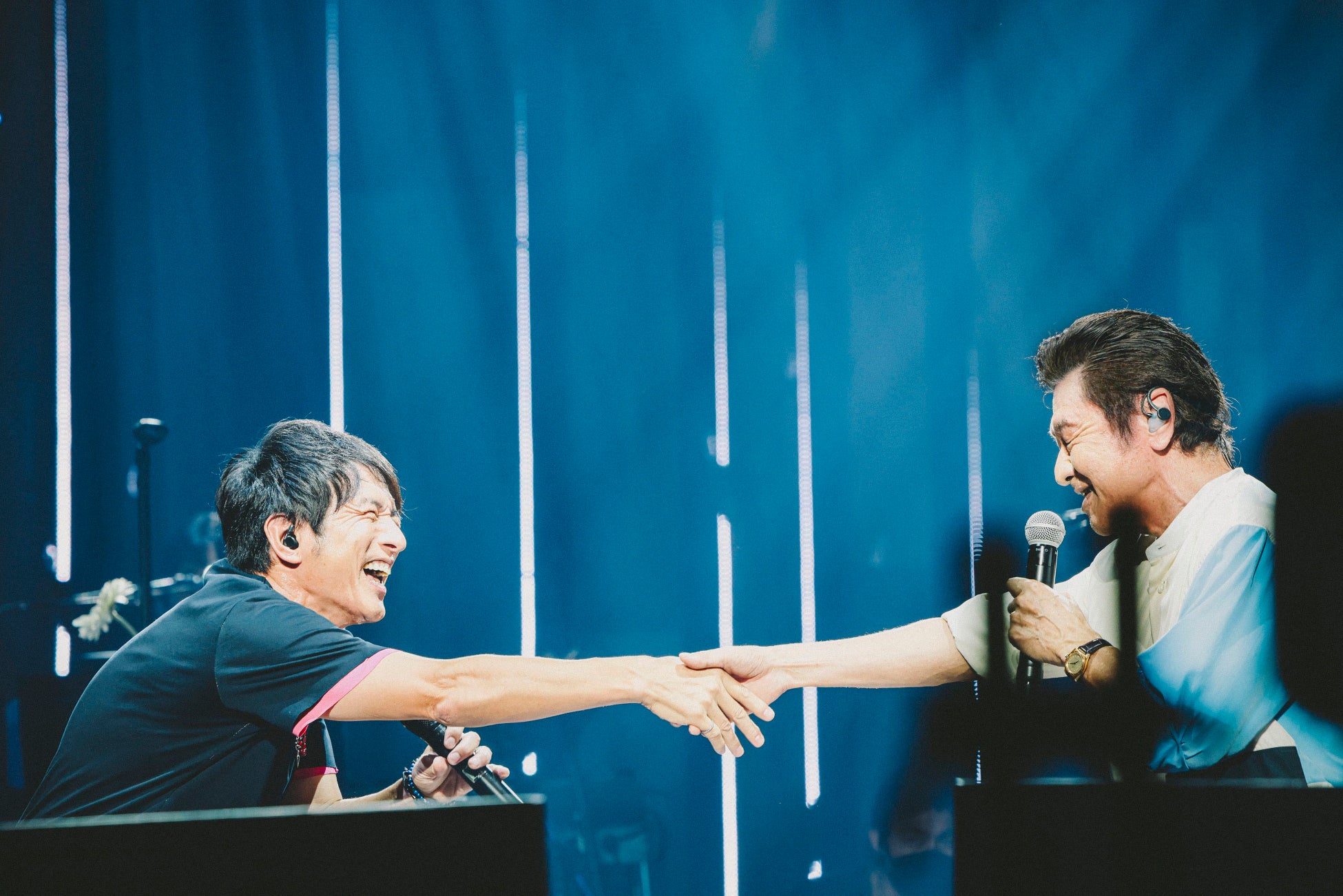 突如上がった会場の熱気をクールダウンするように、サザンオールスターズの「SEA SIDE WOMAN BLUES」を桑田がゆったりと歌い上げると、その余韻を残したまま、次なるシークレットゲストが呼び込まれました。日本のフォークデュオ・バズが1972年に発表した楽曲「ケンとメリー〜愛と風のように〜」のイントロに乗せて、なんとMr.Children【桜井和寿】が登場!大歓声と共に会場が驚きどよめく中、そのまま桑田佳祐とのデュエットになだれ込みます。桑田と桜井の共演は、2006年の“THE 夢人島 Fes.”以来なんと19年ぶり。桑田率いるバンドの演奏でMr.Childrenの名曲「HANABI」を熱唱し、桜井がサザンで大好きな曲と挙げる「慕情」をデュエット。この二人が揃って期待されるのは、桑田佳祐&Mr.Children名義で1995年にリリースされた「奇跡の地球(ほし)」。未だJ-POPシーンで燦然と輝き続ける名曲が、前置きなく19年ぶりに突然披露されるこの瞬間こそ“奇跡”です。