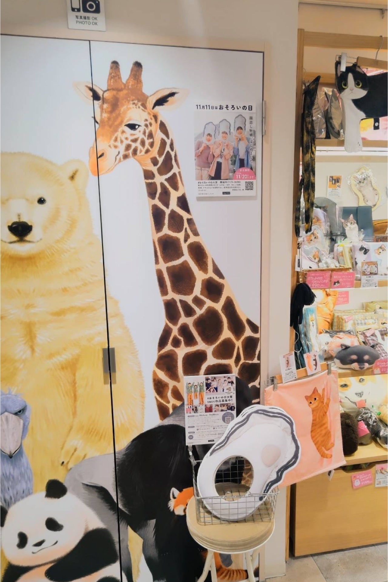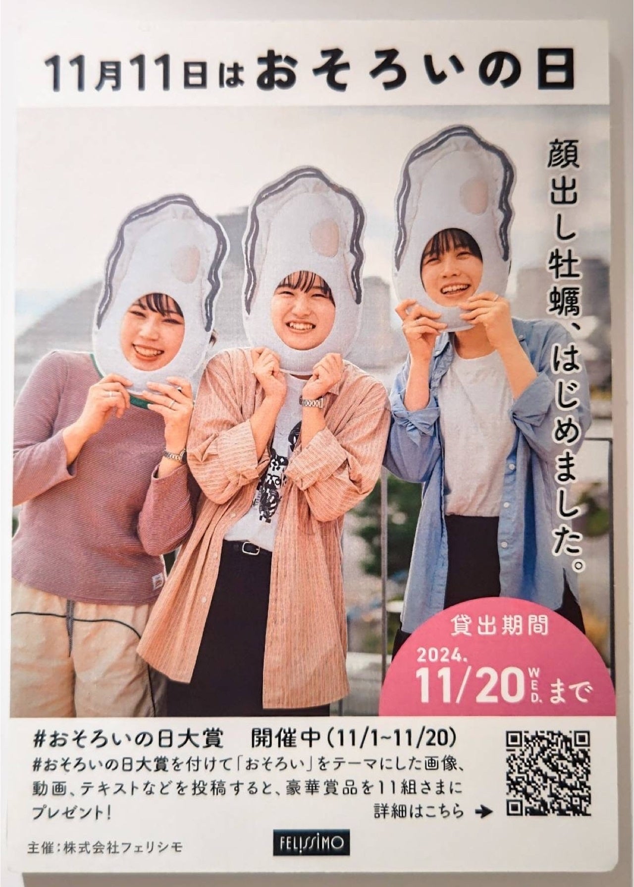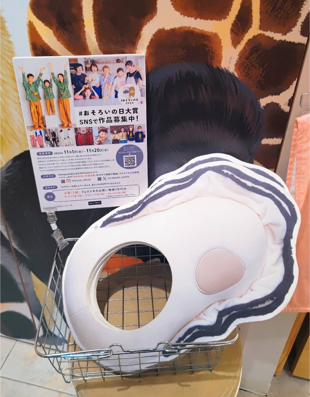 フェリシモが展開する、ユニーク雑貨ブランド「YOU+MORE![フェリシモユーモア]」の関東唯一の常設店「エキュート上野店」は、記念日「おそろいの日」に合わせ、11月2日より「顔出し牡蠣はじめました」と、ユーモアあふれるフォトプロップスを店内に設置しています。SNSで話題を集めるYOU+MORE!のアイテム「なぜかかわいい もっちりクッション抱っこ牡蠣」をモデルに制作したグッズで、顔を出しをして写真を撮って楽しむことができます。フェリシモが11月20日まで開催している、大賞は3万円分のお買い物券がもらえるイベント、「#おそろいの日大賞」の紹介も行っています。