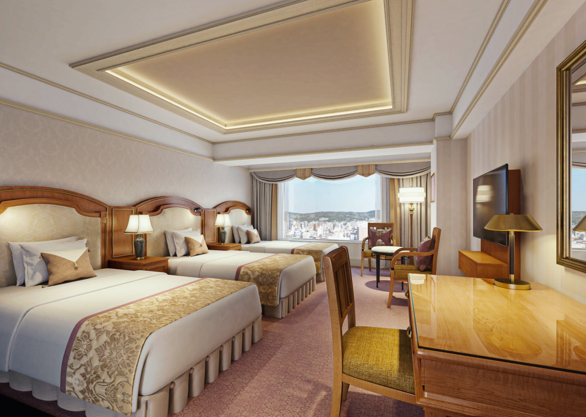 今回のリニューアルでは、開業時より継承してきたヨーロピアンクラシックの上品なデザインはそのままに、バス・トイレなどの水回りを一新したほか、調光可能な間接照明を取り入れることで居住性の高さを追求し、これまで以上に快適で落ち着きと気品あふれる客室へと生まれ変わりました。また、まだ使用できる家具は廃棄せず、修繕と美装を施して再生利用することで環境に配慮したサステナブルな改装を進めてまいりました。ホテルとともに時を重ねた家具の趣を残しつつリメイクすることで、時代を超えて変わらない普遍的な煌びやかさと、クラシカルで重厚感のある空間を演出しています。