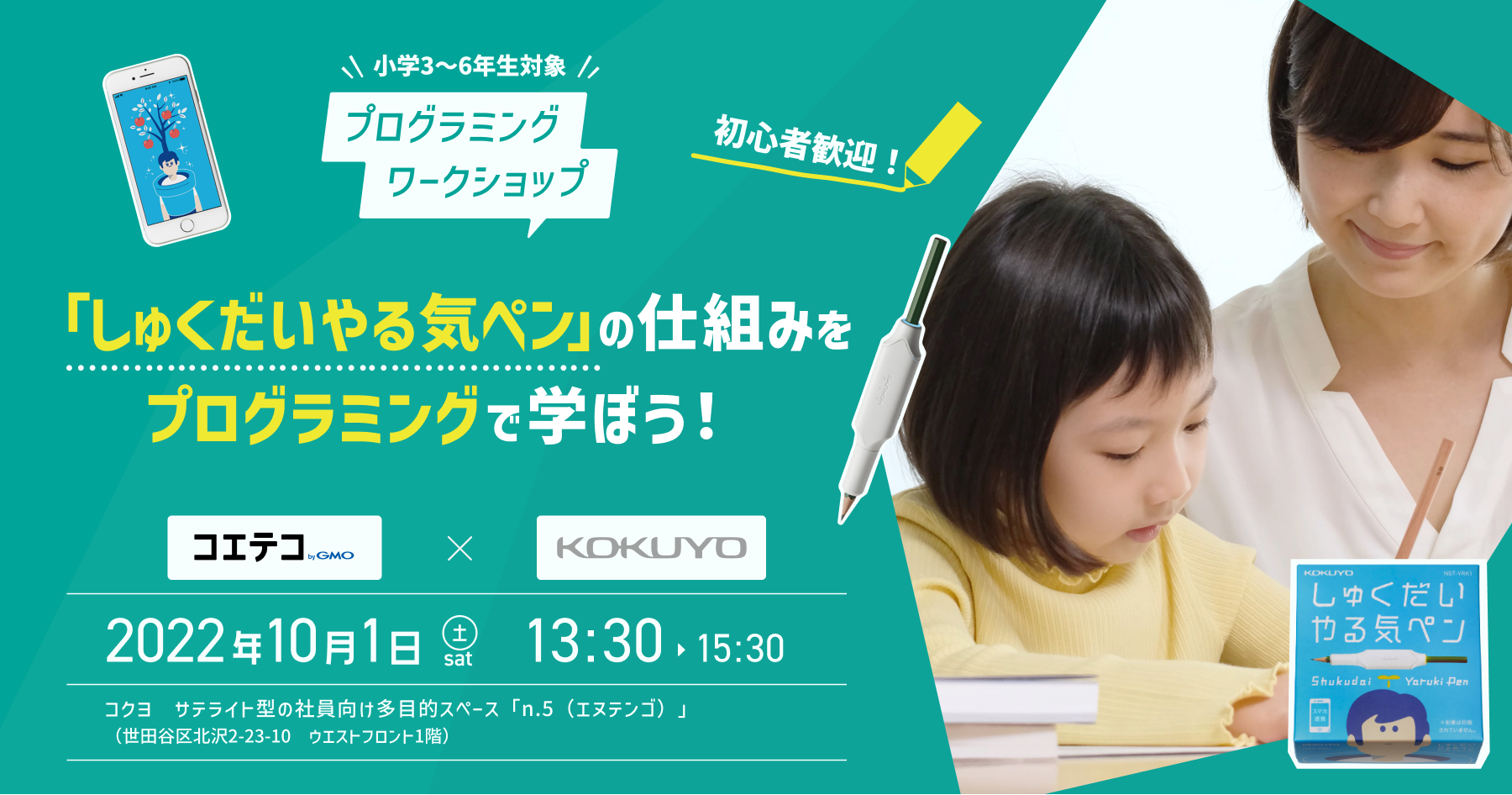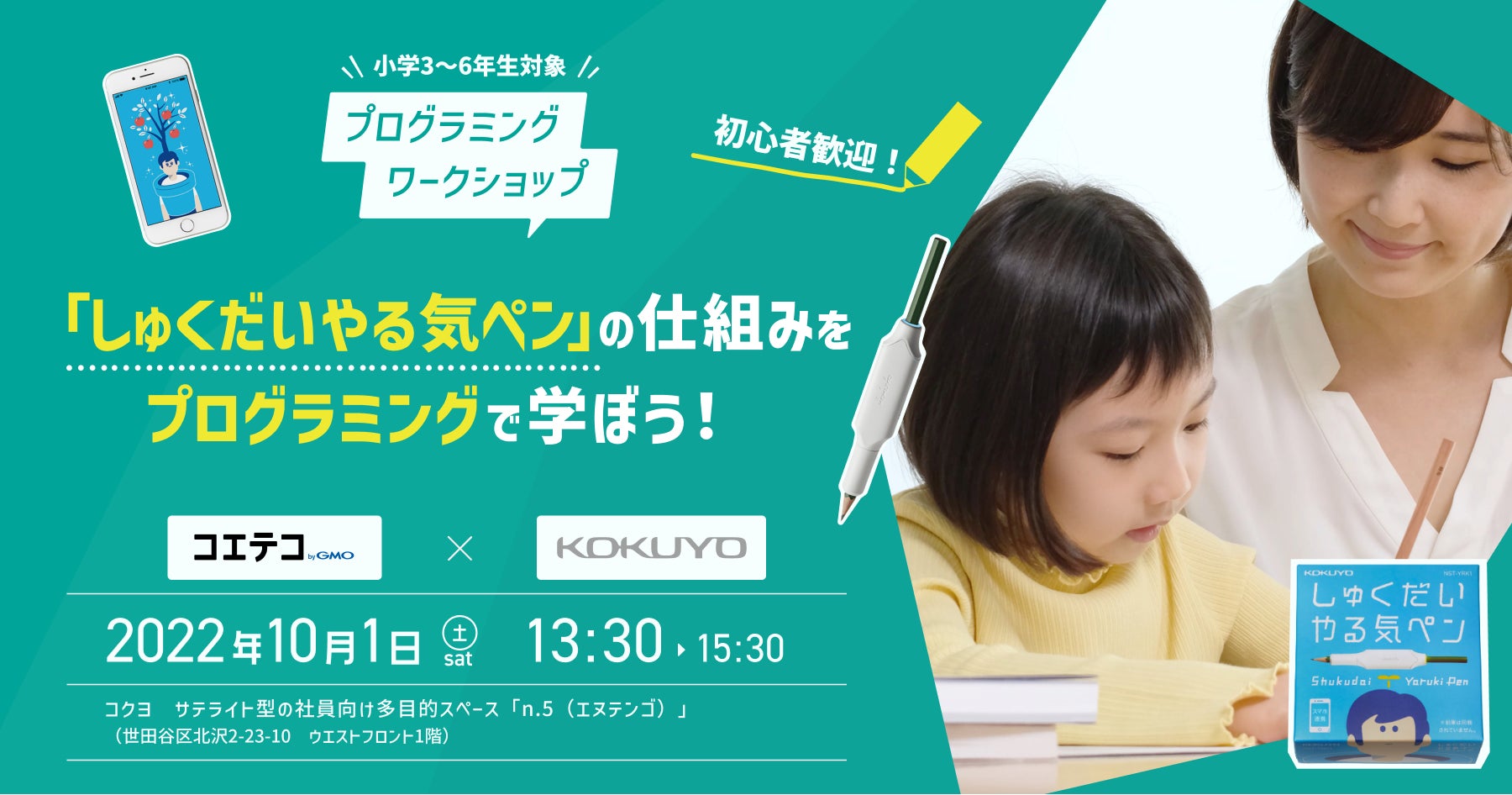 GMOインターネットグループのGMOメディア株式会社(代表取締役社長:森 輝幸 以下、GMOメディア)が運営するプログラミング教育ポータルサイト「コエテコ byGMO」(URL:https://coeteco.jp/)とコクヨ株式会社(代表取締役社長:黒田 英邦 以下、コクヨ)は、2022年10月1日(土)にコクヨが運営するサテライト型の社員向け多目的スペース「n.5(エヌテンゴ)」(所在地:東京都世田谷区下北沢)において、小学生向けの無料プログラミングワークショップを開催いたします。