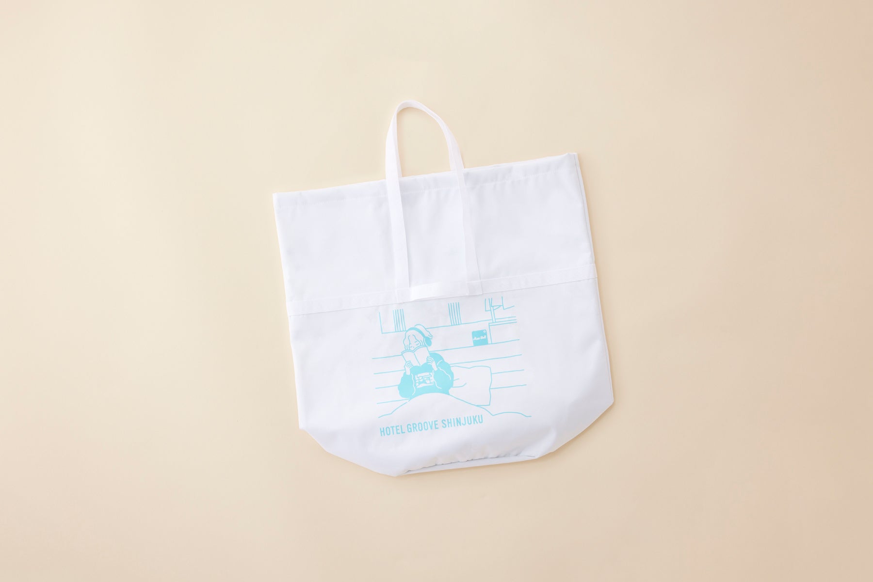 読書と音楽に浸るひとときを描いたデザイン。ホテルで過ごす“自分時間”の心地よさを表現しています。ホテルの住所や電話番号といった情報を、レコードやカセットテープが回るようにイラストとしてあしらいました。素材は、肌触りがやさしく環境にも配慮されたオーガニックコットン100%。感性で楽しむ“新宿・歌舞伎町”のお土産としておすすめ。